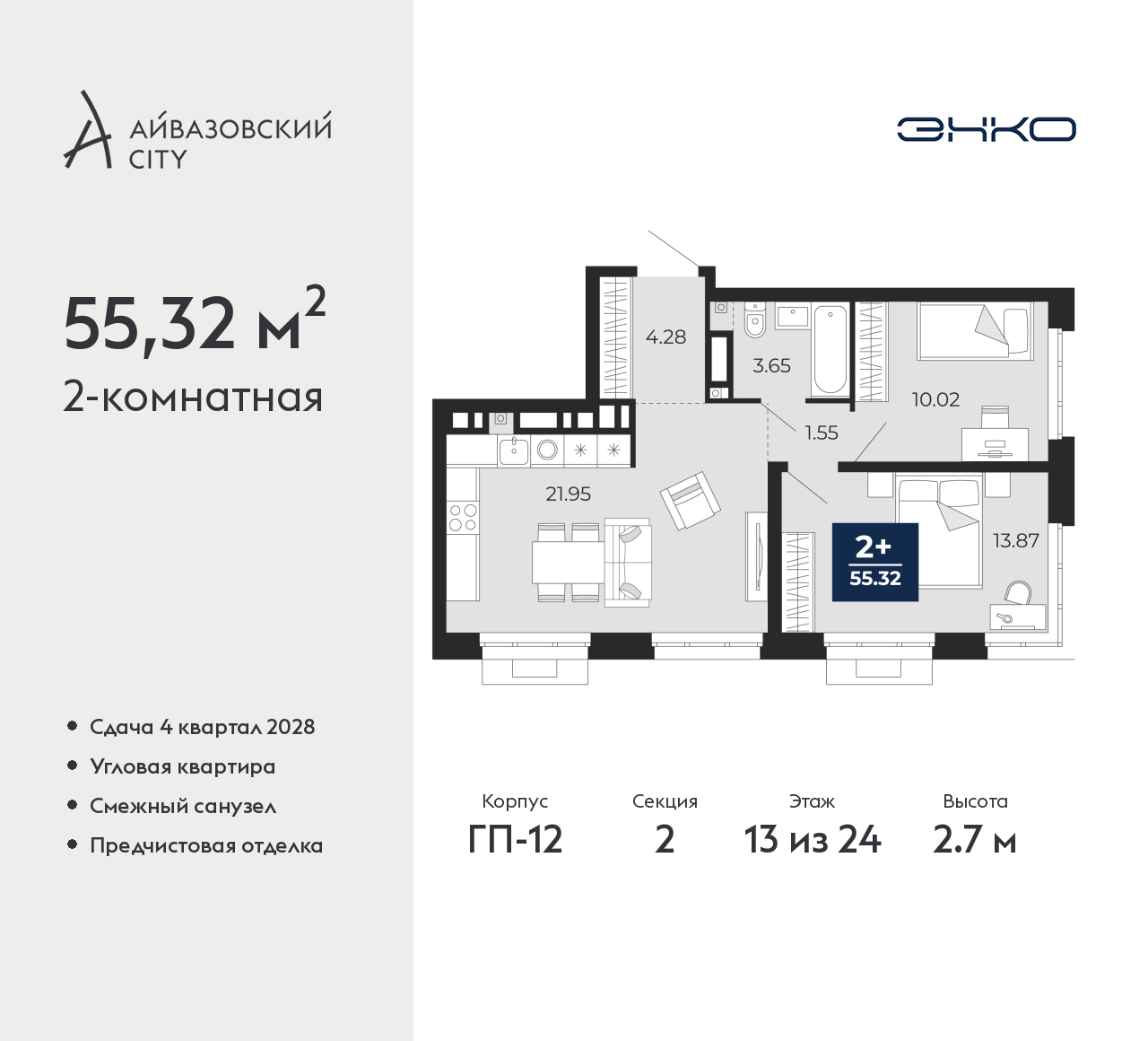 Продается 2-комн. квартира от застройщика с предчистовой отделкой в ЖК "Айвазовский City" на 13 этаже. Общая площадь: 55.32 кв.м., жилая: 23.89 кв.м., площадь просторной кухни-столовой: 21.95 кв.м. Угловая квартира, идеально подойдет любителям тишины и панорамных видов. В квартире один совмещенный санузел. Высота потолков 2.7 м. Дом монолитный, многоподъездный, высотой 24 этажа. Квартира находится во 2-й секции в корпусе ГП-12. На этаже 6 квартир. В подъезде 1 пассажирский и 1 грузовой лифт. Окончание строительства - 4 квартал 2028 года. Оформление сделки по договору долевого участия. Новый жилой район располагается в живописном месте на берегу Туры в центральной части города. Принципиально новое пространство для жизни в центре современного города для тех, чьи мечты сбываются, кто нацелен на постоянный рост, перемены к лучшему для себя и своих близких. Каждая деталь Айвазовский City вдохновляет и заряжает на новые свершения: авторская архитектура, сбалансированная продуманная инфраструктура, дизайнерские дворы со спортивными и детскими площадками, парковые зоны с фонтанами, водный канал, украшающий центральный прогулочный маршрут района и многое другое. В 2019 года проект стал лауреатом престижной премии Urban Awards 2019 в номинации «Лучший строящийся региональный жилой комплекс бизнес-класса». Главная особенность Айвазовский City - соседство разных архитектурных школ в рамках одного дома. Изысканная классика, выразительная эклектика и оригинальный модерн - жить в одном из таких домов настоящий повод для гордости. Айвазовский City это идеальное сочетание комфорта, технологий и развитой инфраструктуры. Вход в подъезд возможен с улицы и со двора. Отправляясь на работу или за покупками, жители могут выйти с внешней стороны дома, а для прогулки с ребенком – со стороны двора. Экологически чистые материалы и энергосберегающие технологии, качественное освещение общественных зон, видеонаблюдение по всей территории жилого района (в том числе в подъездах, лифтах и в подземном паркинге), закрытые дворы с доступом только для жителей Айвазовский City. Часть домов в Айвазовский City будут оснащены подземным паркингом. Востребованный в нашем климатическом поясе формат хранения автомобилей защитит собственность владельца в любое время года. Аккредитация в банках: ОАО «Альфа-Банк», ПАО Банк «ВТБ», «Сбербанк России», ПАО «Газпромбанк», ПАО «Промсвязьбанк» и других. (AQID02525842)