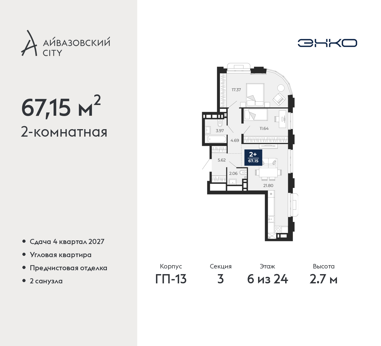 - Общая площадь 67.15 м²
