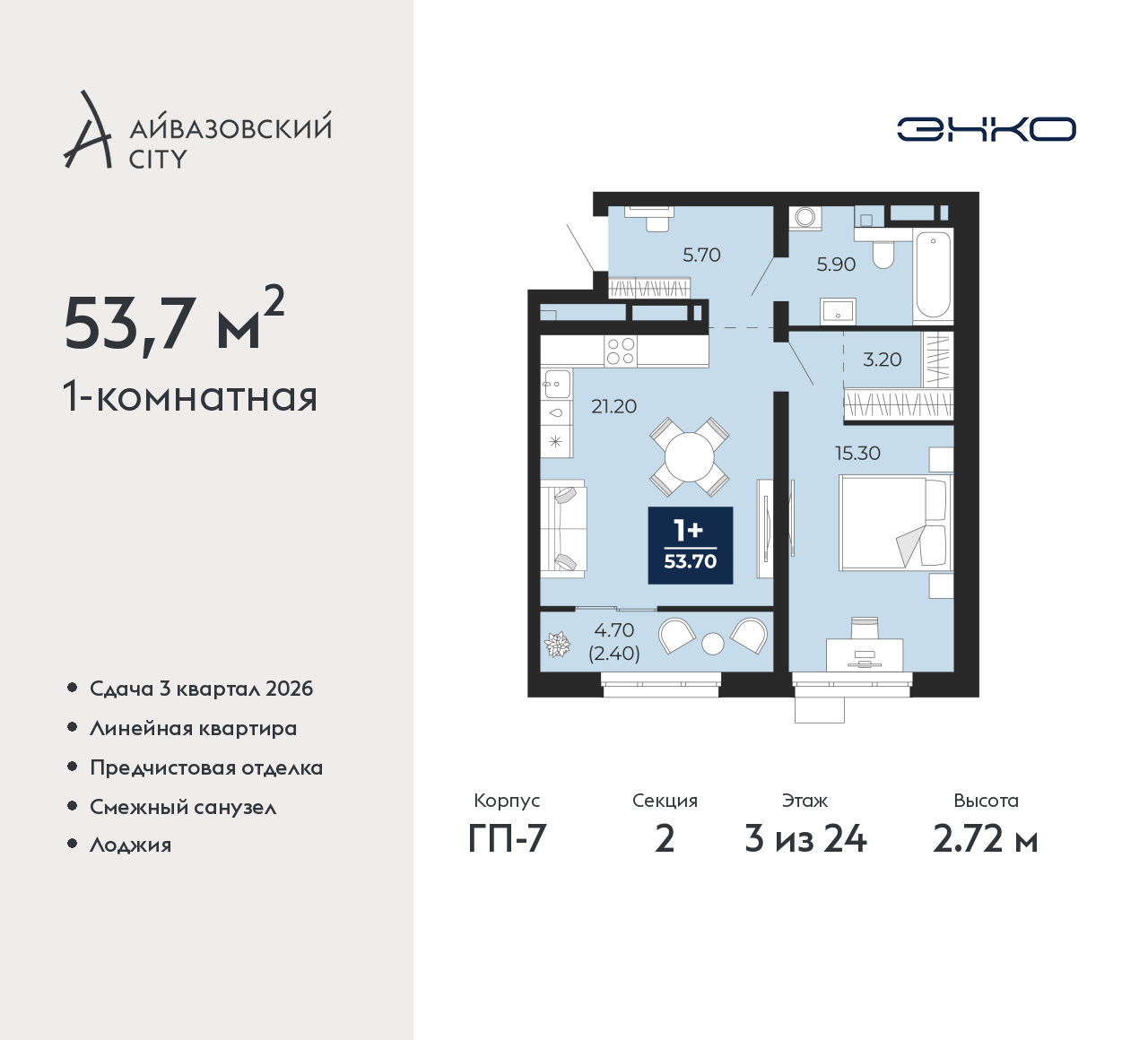 1-комн. квартира с предчистовой отделкой в ЖК "Айвазовский City" на 3 этаже. Общая площадь: 53.7 кв.м., жилая: 15.3 кв.м., площадь просторной кухни-столовой: 21.2 кв.м. Все окна выходят на одну сторону. В квартире одна лоджия, один совмещенный санузел. Высота потолков 2.72 м. Дом монолитный, многоподъездный, переменной этажности, от 9 до 24 этажей. Квартира находится во 2-й секции высотой 24 этажа в корпусе ГП-7. На этаже 7 квартир. В подъезде 1 пассажирский и 2 грузовых лифта. Окончание строительства - 3 квартал 2026 года. Оформление сделки по договору долевого участия. Новый жилой район располагается в живописном месте на берегу Туры в центральной части города. Принципиально новое пространство для жизни в центре современного города для тех, чьи мечты сбываются, кто нацелен на постоянный рост, перемены к лучшему для себя и своих близких. Каждая деталь Айвазовский City вдохновляет и заряжает на новые свершения: авторская архитектура, сбалансированная продуманная инфраструктура, дизайнерские дворы со спортивными и детскими площадками, парковые зоны с фонтанами, водный канал, украшающий центральный прогулочный маршрут района и многое другое. В 2019 года проект стал лауреатом престижной премии Urban Awards 2019 в номинации «Лучший строящийся региональный жилой комплекс бизнес-класса». Главная особенность Айвазовский City - соседство разных архитектурных школ в рамках одного дома. Изысканная классика, выразительная эклектика и оригинальный модерн - жить в одном из таких домов настоящий повод для гордости. Айвазовский City это идеальное сочетание комфорта, технологий и развитой инфраструктуры. Вход в подъезд возможен с улицы и со двора. Отправляясь на работу или за покупками, жители могут выйти с внешней стороны дома, а для прогулки с ребенком – со стороны двора. Экологически чистые материалы и энергосберегающие технологии, качественное освещение общественных зон, видеонаблюдение по всей территории жилого района (в том числе в подъездах, лифтах и в подземном паркинге), закрытые дворы с доступом только для жителей Айвазовский City. Часть домов в Айвазовский City будут оснащены подземным паркингом. Востребованный в нашем климатическом поясе формат хранения автомобилей защитит собственность владельца в любое время года. Аккредитация в банках: «Сбербанк России», ПАО Банк «ВТБ», ПАО «Газпромбанк», ОАО «Альфа-Банк», ПАО Банк «ФК Открытие» и других. (AQID02487918)