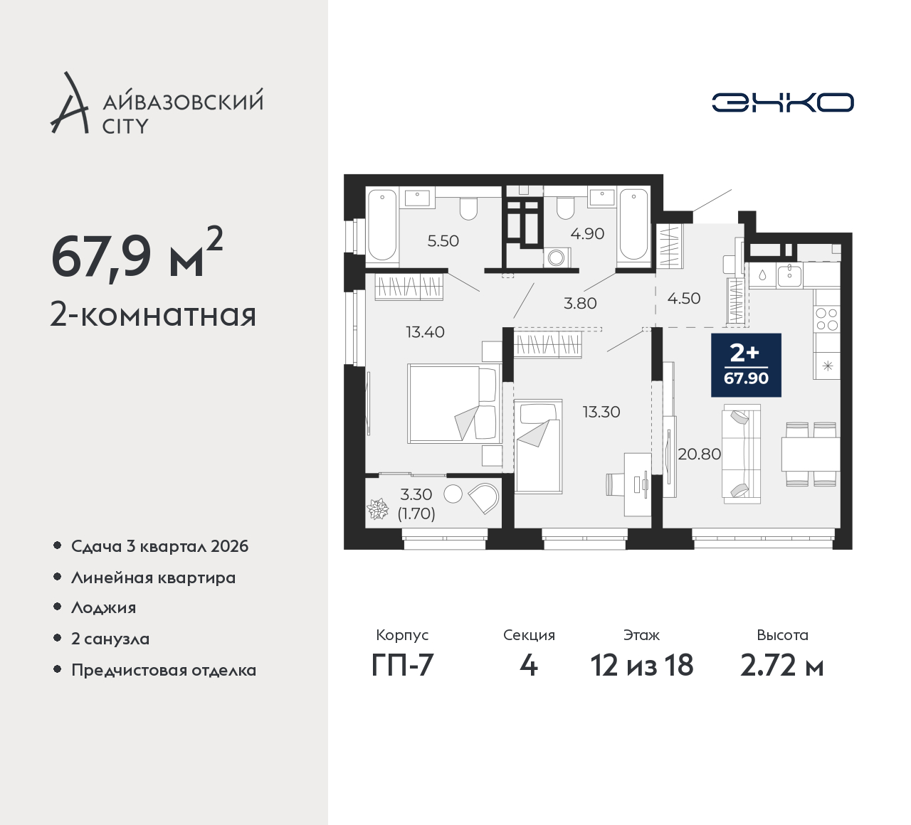 Квартира 2-комн., 68 м2, 12/18 этаж,