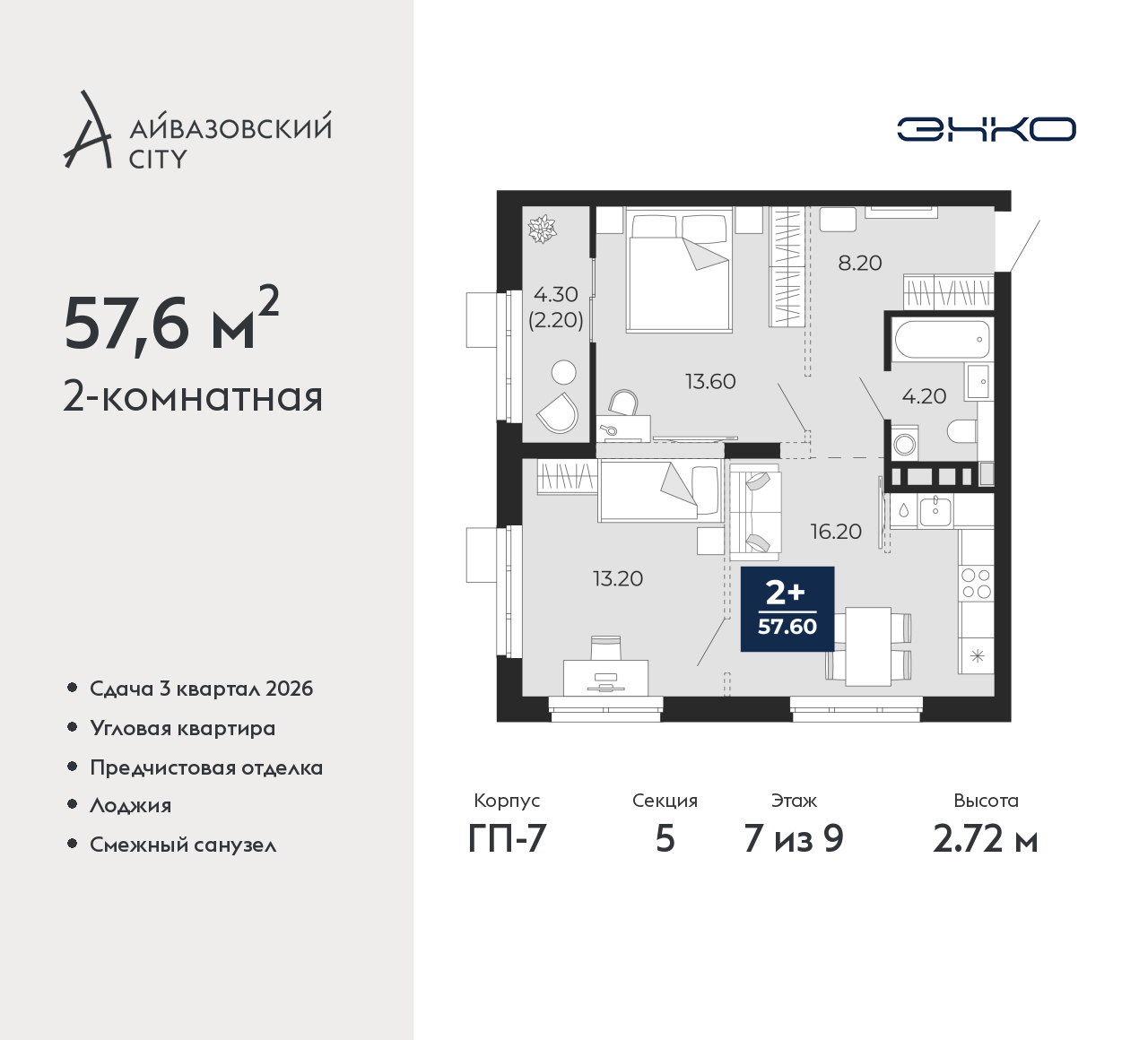 - Общая площадь 57.6 м²