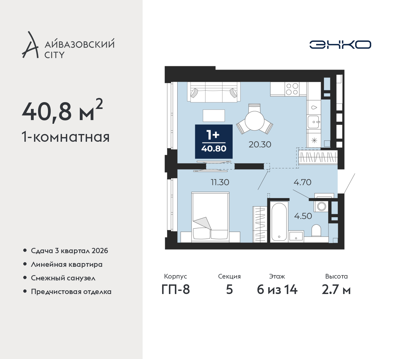 1-комн. квартира с предчистовой отделкой в ЖК "Айвазовский City" на 6 этаже. Общая площадь: 40.8 кв.м., жилая: 11.3 кв.м., площадь просторной кухни-столовой: 20.3 кв.м. Все окна выходят на одну сторону. В квартире один совмещенный санузел. Высота потолков 2.7 м. Дом монолитный, многоподъездный, переменной этажности, от 14 до 24 этажей. Квартира находится в 5-й секции высотой 14 этажей в корпусе ГП-8. На этаже 5 квартир. В подъезде 1 пассажирский и 1 грузовой лифт. Окончание строительства - 3 квартал 2026 года. Оформление сделки по договору долевого участия. Новый жилой район располагается в живописном месте на берегу Туры в центральной части города. Принципиально новое пространство для жизни в центре современного города для тех, чьи мечты сбываются, кто нацелен на постоянный рост, перемены к лучшему для себя и своих близких. Каждая деталь Айвазовский City вдохновляет и заряжает на новые свершения: авторская архитектура, сбалансированная продуманная инфраструктура, дизайнерские дворы со спортивными и детскими площадками, парковые зоны с фонтанами, водный канал, украшающий центральный прогулочный маршрут района и многое другое. В 2019 года проект стал лауреатом престижной премии Urban Awards 2019 в номинации «Лучший строящийся региональный жилой комплекс бизнес-класса». Главная особенность Айвазовский City - соседство разных архитектурных школ в рамках одного дома. Изысканная классика, выразительная эклектика и оригинальный модерн - жить в одном из таких домов настоящий повод для гордости. Айвазовский City это идеальное сочетание комфорта, технологий и развитой инфраструктуры. Вход в подъезд возможен с улицы и со двора. Отправляясь на работу или за покупками, жители могут выйти с внешней стороны дома, а для прогулки с ребенком – со стороны двора. Экологически чистые материалы и энергосберегающие технологии, качественное освещение общественных зон, видеонаблюдение по всей территории жилого района (в том числе в подъездах, лифтах и в подземном паркинге), закрытые дворы с доступом только для жителей Айвазовский City. Часть домов в Айвазовский City будут оснащены подземным паркингом. Востребованный в нашем климатическом поясе формат хранения автомобилей защитит собственность владельца в любое время года. Аккредитация в банках: «Сбербанк России», ОАО «Альфа-Банк», ПАО «Газпромбанк», ПАО Банк «ВТБ», ПАО «Промсвязьбанк» и других. (AQID02477175)