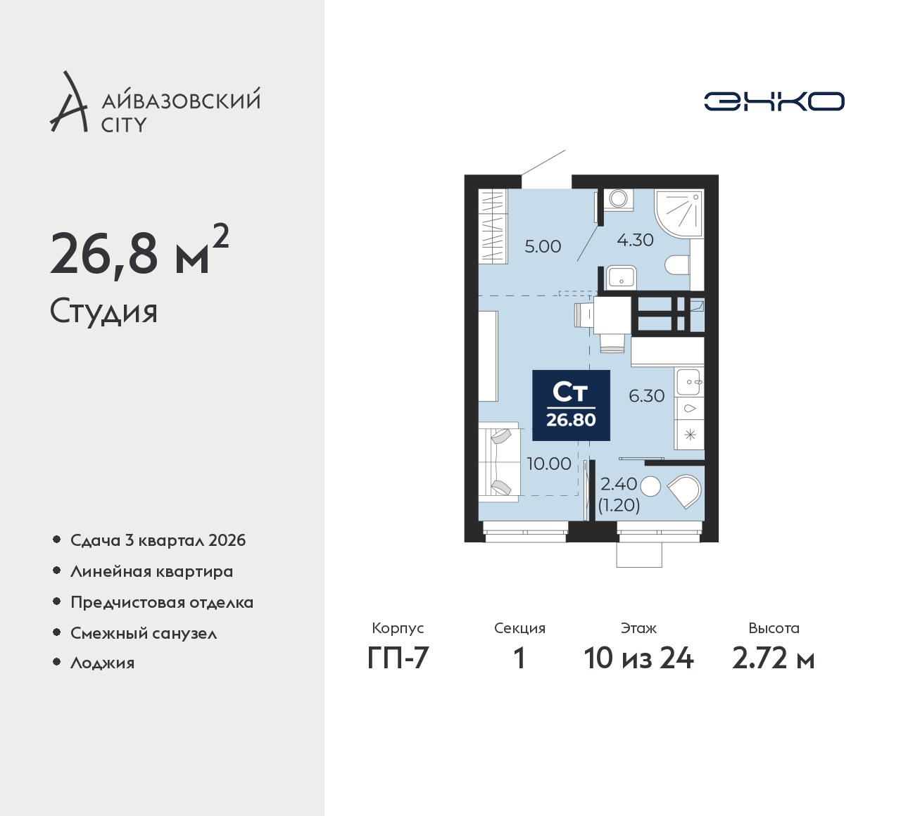 Просторная 1-комн. квартира-студия с предчистовой отделкой в ЖК "Айвазовский City" на 10 этаже. Общая площадь: 26.8 кв.м., площадь гостиной 17.1 кв.м., из которых 6.7 кв.м. выделено под кухонную зону. Все окна выходят на одну сторону. В квартире одна лоджия, один совмещенный санузел. Высота потолков 2.72 м. Дом монолитный, многоподъездный, переменной этажности, от 9 до 24 этажей. Квартира находится в 1-й секции высотой 24 этажа в корпусе ГП-7. На этаже 6 квартир. В подъезде 1 пассажирский и 2 грузовых лифта. Окончание строительства - 3 квартал 2026 года. Оформление сделки по договору долевого участия. Новый жилой район располагается в живописном месте на берегу Туры в центральной части города. Принципиально новое пространство для жизни в центре современного города для тех, чьи мечты сбываются, кто нацелен на постоянный рост, перемены к лучшему для себя и своих близких. Каждая деталь Айвазовский City вдохновляет и заряжает на новые свершения: авторская архитектура, сбалансированная продуманная инфраструктура, дизайнерские дворы со спортивными и детскими площадками, парковые зоны с фонтанами, водный канал, украшающий центральный прогулочный маршрут района и многое другое. В 2019 года проект стал лауреатом престижной премии Urban Awards 2019 в номинации «Лучший строящийся региональный жилой комплекс бизнес-класса». Главная особенность Айвазовский City - соседство разных архитектурных школ в рамках одного дома. Изысканная классика, выразительная эклектика и оригинальный модерн - жить в одном из таких домов настоящий повод для гордости. Айвазовский City это идеальное сочетание комфорта, технологий и развитой инфраструктуры. Вход в подъезд возможен с улицы и со двора. Отправляясь на работу или за покупками, жители могут выйти с внешней стороны дома, а для прогулки с ребенком – со стороны двора. Экологически чистые материалы и энергосберегающие технологии, качественное освещение общественных зон, видеонаблюдение по всей территории жилого района (в том числе в подъездах, лифтах и в подземном паркинге), закрытые дворы с доступом только для жителей Айвазовский City. Часть домов в Айвазовский City будут оснащены подземным паркингом. Востребованный в нашем климатическом поясе формат хранения автомобилей защитит собственность владельца в любое время года. Аккредитация в банках: ПАО Банк «ВТБ», ПАО «Газпромбанк», «Сбербанк России», ОАО «Альфа-Банк», АО "ДОМ.РФ" и других. (AQID02483552)