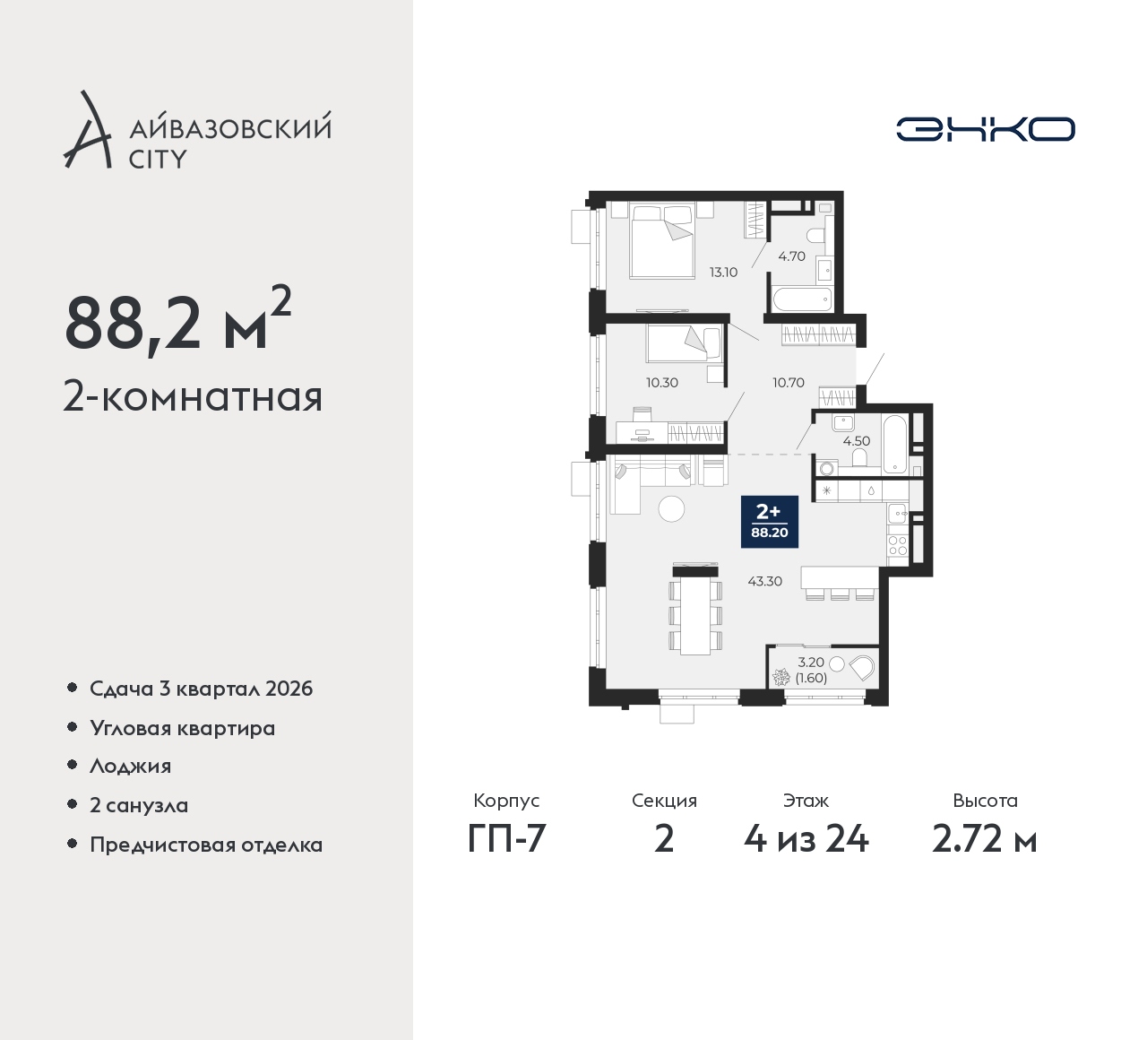 - Общая площадь 88.2 м²