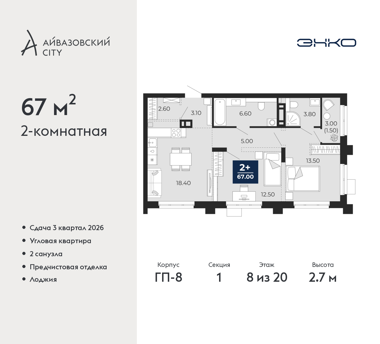 2-комн. квартира с предчистовой отделкой в ЖК "Айвазовский City" на 8 этаже. Общая площадь: 67 кв.м., жилая: 26 кв.м., площадь просторной кухни-столовой: 18.4 кв.м. Угловая квартира, идеально подойдет любителям тишины и панорамных видов. В квартире одна лоджия, два совмещенных санузла. Высота потолков 2.7 м. Дом монолитный, многоподъездный, переменной этажности, от 14 до 24 этажей. Квартира находится в 1-й секции высотой 20 этажей в корпусе ГП-8. На этаже 6 квартир. В подъезде 1 пассажирский и 1 грузовой лифт. Окончание строительства - 3 квартал 2026 года. Оформление сделки по договору долевого участия. Новый жилой район располагается в живописном месте на берегу Туры в центральной части города. Принципиально новое пространство для жизни в центре современного города для тех, чьи мечты сбываются, кто нацелен на постоянный рост, перемены к лучшему для себя и своих близких. Каждая деталь Айвазовский City вдохновляет и заряжает на новые свершения: авторская архитектура, сбалансированная продуманная инфраструктура, дизайнерские дворы со спортивными и детскими площадками, парковые зоны с фонтанами, водный канал, украшающий центральный прогулочный маршрут района и многое другое. В 2019 года проект стал лауреатом престижной премии Urban Awards 2019 в номинации «Лучший строящийся региональный жилой комплекс бизнес-класса». Главная особенность Айвазовский City - соседство разных архитектурных школ в рамках одного дома. Изысканная классика, выразительная эклектика и оригинальный модерн - жить в одном из таких домов настоящий повод для гордости. Айвазовский City это идеальное сочетание комфорта, технологий и развитой инфраструктуры. Вход в подъезд возможен с улицы и со двора. Отправляясь на работу или за покупками, жители могут выйти с внешней стороны дома, а для прогулки с ребенком – со стороны двора. Экологически чистые материалы и энергосберегающие технологии, качественное освещение общественных зон, видеонаблюдение по всей территории жилого района (в том числе в подъездах, лифтах и в подземном паркинге), закрытые дворы с доступом только для жителей Айвазовский City. Часть домов в Айвазовский City будут оснащены подземным паркингом. Востребованный в нашем климатическом поясе формат хранения автомобилей защитит собственность владельца в любое время года. Аккредитация в банках: ПАО Банк «ВТБ», «Сбербанк России», ОАО «Альфа-Банк», ПАО «Газпромбанк», ПАО «Промсвязьбанк» и других. (AQID02483687)