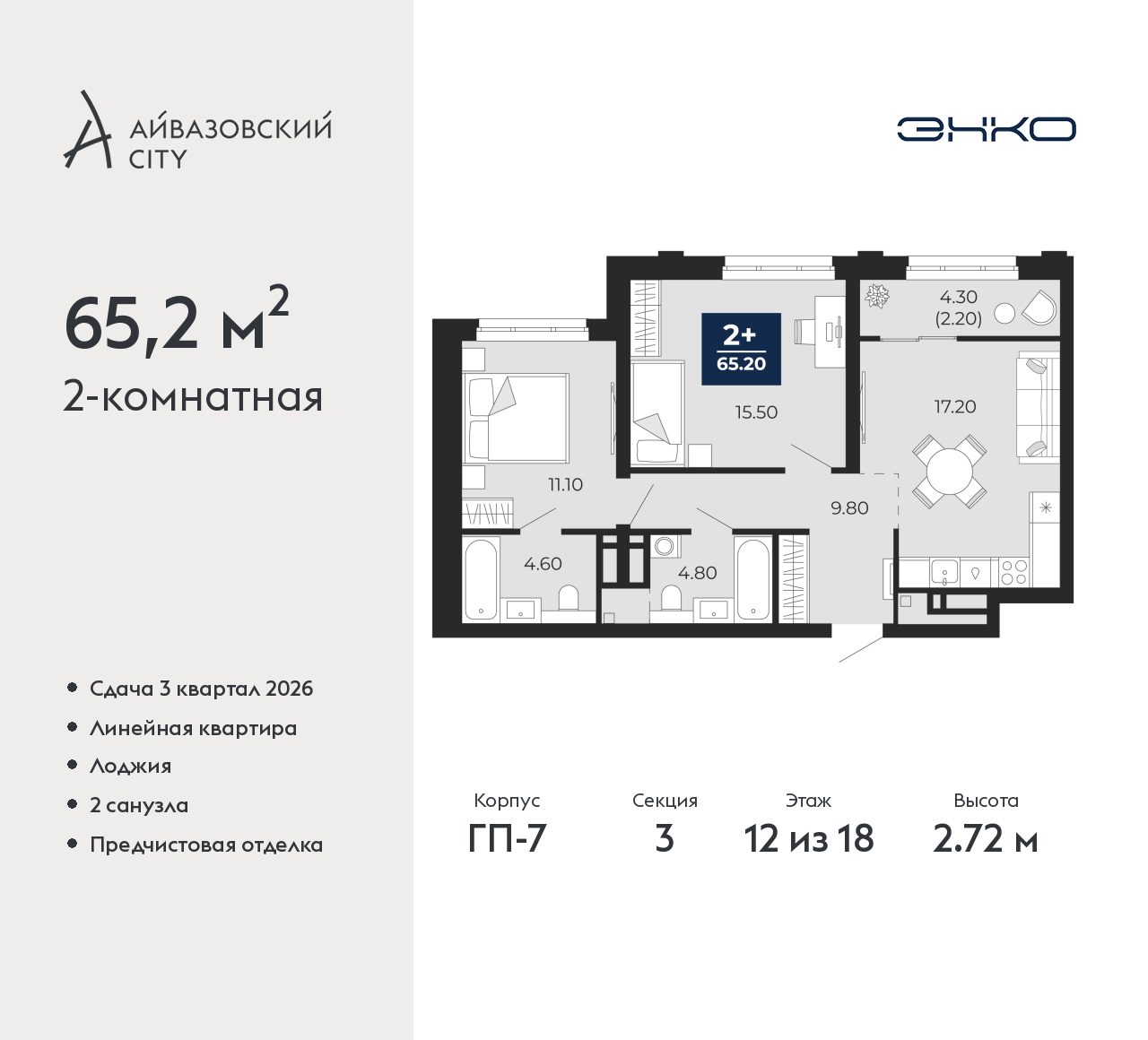 - Общая площадь 65.2 м²