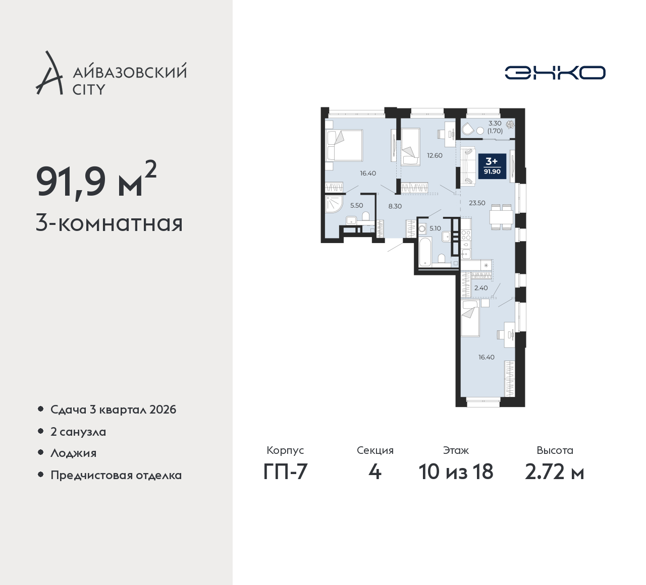 3-комн. квартира с предчистовой отделкой в ЖК "Айвазовский City" на 10 этаже. Общая площадь: 91.9 кв.м., жилая: 45.4 кв.м., площадь просторной кухни-столовой: 23.5 кв.м. Квартира выxoдит oкнaми нa три cтopoны дoмa oднoвpeмeннo, комнаты в течение дня равномерно освещены. В квартире одна лоджия, два совмещенных санузла. Высота потолков 2.72 м. Дом монолитный, многоподъездный, переменной этажности, от 9 до 24 этажей. Квартира находится в 4-й секции высотой 18 этажей в корпусе ГП-7. На этаже 5 квартир. В подъезде 1 пассажирский и 2 грузовых лифта. Окончание строительства - 3 квартал 2026 года. Оформление сделки по договору долевого участия. Новый жилой район располагается в живописном месте на берегу Туры в центральной части города. Принципиально новое пространство для жизни в центре современного города для тех, чьи мечты сбываются, кто нацелен на постоянный рост, перемены к лучшему для себя и своих близких. Каждая деталь Айвазовский City вдохновляет и заряжает на новые свершения: авторская архитектура, сбалансированная продуманная инфраструктура, дизайнерские дворы со спортивными и детскими площадками, парковые зоны с фонтанами, водный канал, украшающий центральный прогулочный маршрут района и многое другое. В 2019 года проект стал лауреатом престижной премии Urban Awards 2019 в номинации «Лучший строящийся региональный жилой комплекс бизнес-класса». Главная особенность Айвазовский City - соседство разных архитектурных школ в рамках одного дома. Изысканная классика, выразительная эклектика и оригинальный модерн - жить в одном из таких домов настоящий повод для гордости. Айвазовский City это идеальное сочетание комфорта, технологий и развитой инфраструктуры. Вход в подъезд возможен с улицы и со двора. Отправляясь на работу или за покупками, жители могут выйти с внешней стороны дома, а для прогулки с ребенком – со стороны двора. Экологически чистые материалы и энергосберегающие технологии, качественное освещение общественных зон, видеонаблюдение по всей территории жилого района (в том числе в подъездах, лифтах и в подземном паркинге), закрытые дворы с доступом только для жителей Айвазовский City. Часть домов в Айвазовский City будут оснащены подземным паркингом. Востребованный в нашем климатическом поясе формат хранения автомобилей защитит собственность владельца в любое время года. Аккредитация в банках: ПАО Банк «ВТБ», ОАО «Альфа-Банк», «Сбербанк России», ПАО «Газпромбанк», ПАО Банк «ФК Открытие» и других. (AQID02487971)