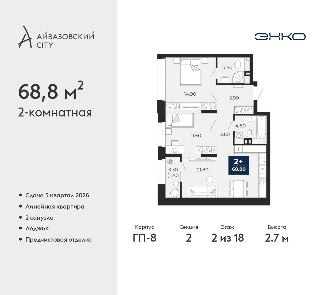Двухкомнатная квартира от застройщика с предчистовой отделкой в ЖК "Айвазовский City" на 2 этаже. Общая площадь: 68.8 кв.м., жилая: 26.5 кв.м., площадь просторной кухни-столовой: 21.8 кв.м. Комнаты изолированные, все окна выходят на одну сторону. В квартире одна лоджия, два совмещенных санузла. Высота потолков 2.7 м. Дом монолитный, многоподъездный, переменной этажности, от 14 до 24 этажей. Квартира находится во 2-й секции высотой 18 этажей в корпусе ГП-8. На этаже 5 квартир. В подъезде 1 пассажирский и 1 грузовой лифт. Окончание строительства - 3 квартал 2026 года. Оформление сделки по договору долевого участия. Новый жилой район располагается в живописном месте на берегу Туры в центральной части города. Принципиально новое пространство для жизни в центре современного города для тех, чьи мечты сбываются, кто нацелен на постоянный рост, перемены к лучшему для себя и своих близких. Каждая деталь Айвазовский City вдохновляет и заряжает на новые свершения: авторская архитектура, сбалансированная продуманная инфраструктура, дизайнерские дворы со спортивными и детскими площадками, парковые зоны с фонтанами, водный канал, украшающий центральный прогулочный маршрут района и многое другое. В 2019 года проект стал лауреатом престижной премии Urban Awards 2019 в номинации «Лучший строящийся региональный жилой комплекс бизнес-класса». Главная особенность Айвазовский City - соседство разных архитектурных школ в рамках одного дома. Изысканная классика, выразительная эклектика и оригинальный модерн - жить в одном из таких домов настоящий повод для гордости. Айвазовский City это идеальное сочетание комфорта, технологий и развитой инфраструктуры. Вход в подъезд возможен с улицы и со двора. Отправляясь на работу или за покупками, жители могут выйти с внешней стороны дома, а для прогулки с ребенком – со стороны двора. Экологически чистые материалы и энергосберегающие технологии, качественное освещение общественных зон, видеонаблюдение по всей территории жилого района (в том числе в подъездах, лифтах и в подземном паркинге), закрытые дворы с доступом только для жителей Айвазовский City. Часть домов в Айвазовский City будут оснащены подземным паркингом. Востребованный в нашем климатическом поясе формат хранения автомобилей защитит собственность владельца в любое время года. Аккредитация в банках: ПАО «Газпромбанк», ПАО Банк «ВТБ», «Сбербанк России», ОАО «Альфа-Банк», АО "ДОМ.РФ" и других. (AQID02488013)