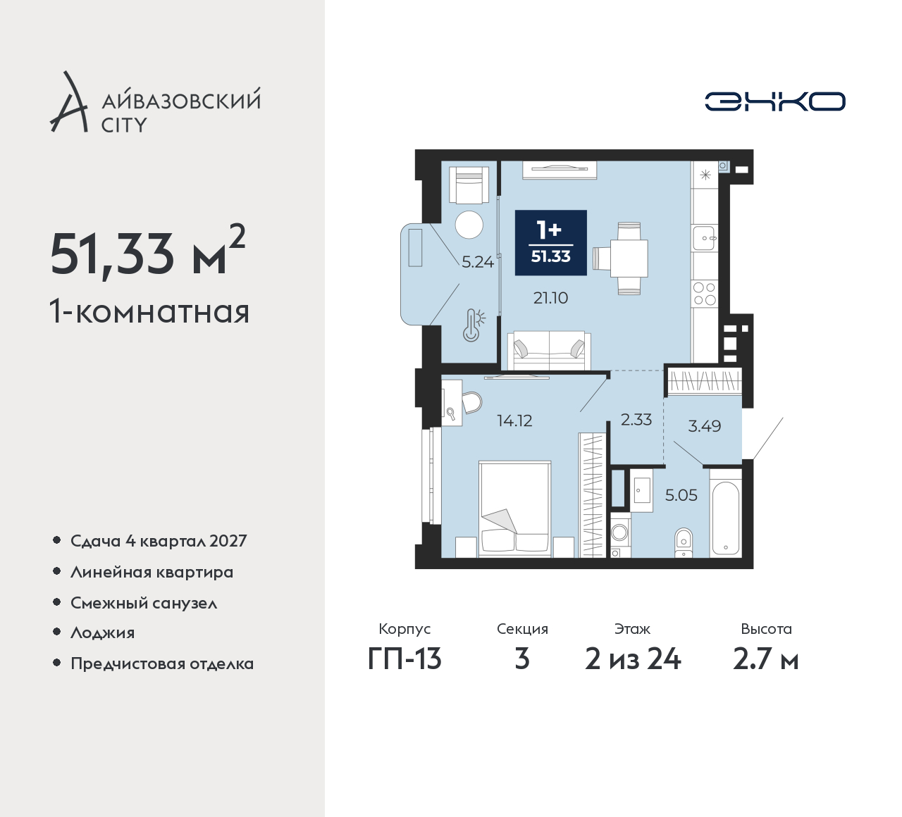 1-комн. квартира с предчистовой отделкой в ЖК "Айвазовский City" на 2 этаже. Общая площадь: 51.33 кв.м., жилая: 14.12 кв.м., площадь просторной кухни-столовой: 21.1 кв.м. Все окна выходят на одну сторону. В квартире одна лоджия, один совмещенный санузел. Высота потолков 2.7 м. Дом монолитный, многоподъездный, высотой 24 этажа. Квартира находится в 3-й секции в корпусе ГП-13. На этаже 9 квартир. В подъезде 1 пассажирский и 1 грузовой лифт. Окончание строительства - 4 квартал 2027 года. Оформление сделки по договору долевого участия. Новый жилой район располагается в живописном месте на берегу Туры в центральной части города. Принципиально новое пространство для жизни в центре современного города для тех, чьи мечты сбываются, кто нацелен на постоянный рост, перемены к лучшему для себя и своих близких. Каждая деталь Айвазовский City вдохновляет и заряжает на новые свершения: авторская архитектура, сбалансированная продуманная инфраструктура, дизайнерские дворы со спортивными и детскими площадками, парковые зоны с фонтанами, водный канал, украшающий центральный прогулочный маршрут района и многое другое. В 2019 года проект стал лауреатом престижной премии Urban Awards 2019 в номинации «Лучший строящийся региональный жилой комплекс бизнес-класса». Главная особенность Айвазовский City - соседство разных архитектурных школ в рамках одного дома. Изысканная классика, выразительная эклектика и оригинальный модерн - жить в одном из таких домов настоящий повод для гордости. Айвазовский City это идеальное сочетание комфорта, технологий и развитой инфраструктуры. Вход в подъезд возможен с улицы и со двора. Отправляясь на работу или за покупками, жители могут выйти с внешней стороны дома, а для прогулки с ребенком – со стороны двора. Экологически чистые материалы и энергосберегающие технологии, качественное освещение общественных зон, видеонаблюдение по всей территории жилого района (в том числе в подъездах, лифтах и в подземном паркинге), закрытые дворы с доступом только для жителей Айвазовский City. Часть домов в Айвазовский City будут оснащены подземным паркингом. Востребованный в нашем климатическом поясе формат хранения автомобилей защитит собственность владельца в любое время года. Аккредитация в банках: ПАО Банк «ВТБ», ПАО «Газпромбанк», ОАО «Альфа-Банк», «Сбербанк России», ПАО «Совкомбанк» и других. (AQID02521053)