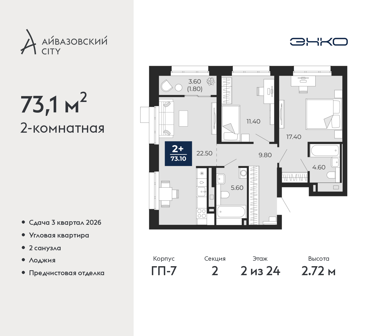 Просторная двухкомнатная квартира с предчистовой отделкой в ЖК "Айвазовский City" на 2 этаже. Общая площадь: 73.1 кв.м., жилая: 28.8 кв.м., площадь просторной кухни-столовой: 22.5 кв.м. Квартира угловая, идеально подойдет любителям тишины и панорамных видов. В квартире одна лоджия, два совмещенных санузла. Высота потолков 2.72 м. Дом монолитный, многоподъездный, переменной этажности, от 9 до 24 этажей. Квартира находится во 2-й секции высотой 24 этажа в корпусе ГП-7. На этаже 7 квартир. В подъезде 1 пассажирский и 2 грузовых лифта. Окончание строительства - 3 квартал 2026 года. Оформление сделки по договору долевого участия. Новый жилой район располагается в живописном месте на берегу Туры в центральной части города. Принципиально новое пространство для жизни в центре современного города для тех, чьи мечты сбываются, кто нацелен на постоянный рост, перемены к лучшему для себя и своих близких. Каждая деталь Айвазовский City вдохновляет и заряжает на новые свершения: авторская архитектура, сбалансированная продуманная инфраструктура, дизайнерские дворы со спортивными и детскими площадками, парковые зоны с фонтанами, водный канал, украшающий центральный прогулочный маршрут района и многое другое. В 2019 года проект стал лауреатом престижной премии Urban Awards 2019 в номинации «Лучший строящийся региональный жилой комплекс бизнес-класса». Главная особенность Айвазовский City - соседство разных архитектурных школ в рамках одного дома. Изысканная классика, выразительная эклектика и оригинальный модерн - жить в одном из таких домов настоящий повод для гордости. Айвазовский City это идеальное сочетание комфорта, технологий и развитой инфраструктуры. Вход в подъезд возможен с улицы и со двора. Отправляясь на работу или за покупками, жители могут выйти с внешней стороны дома, а для прогулки с ребенком – со стороны двора. Экологически чистые материалы и энергосберегающие технологии, качественное освещение общественных зон, видеонаблюдение по всей территории жилого района (в том числе в подъездах, лифтах и в подземном паркинге), закрытые дворы с доступом только для жителей Айвазовский City. Часть домов в Айвазовский City будут оснащены подземным паркингом. Востребованный в нашем климатическом поясе формат хранения автомобилей защитит собственность владельца в любое время года. Аккредитация в банках: ПАО «Газпромбанк», ПАО Банк «ВТБ», «Сбербанк России», ОАО «Альфа-Банк», ПАО «Совкомбанк» и других. (AQID02483618)