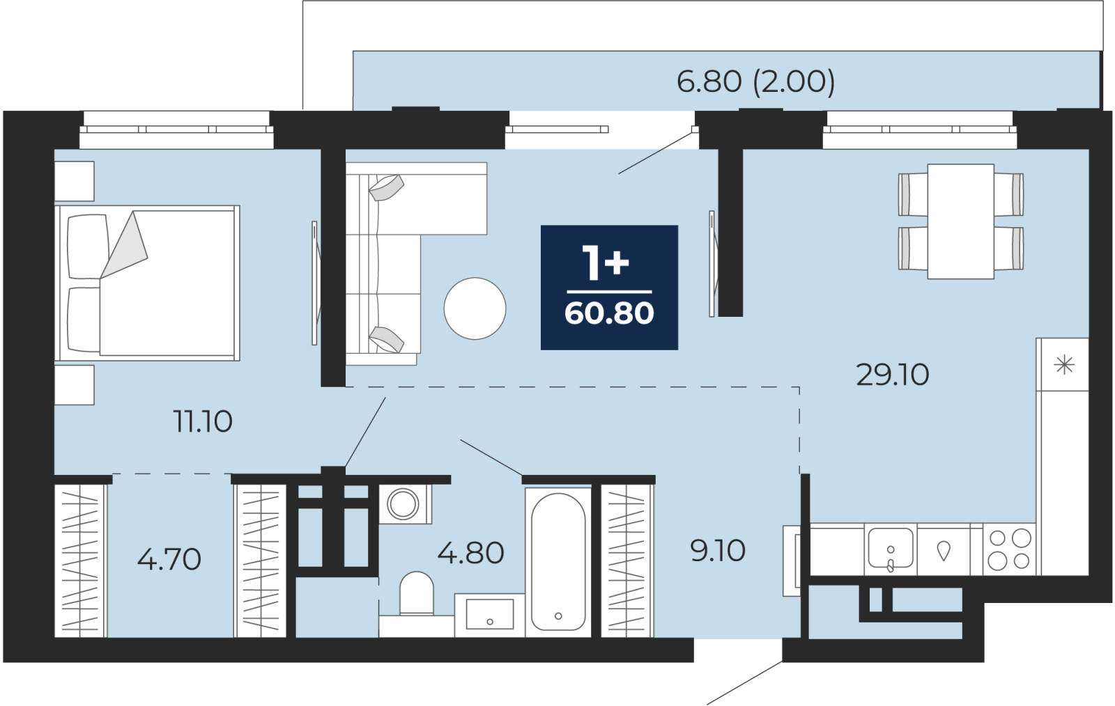 - Общая площадь 60.8 м²