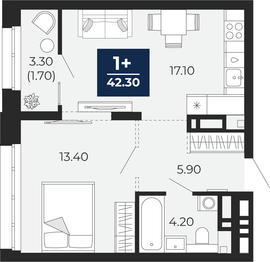 - Общая площадь 42.3 м²