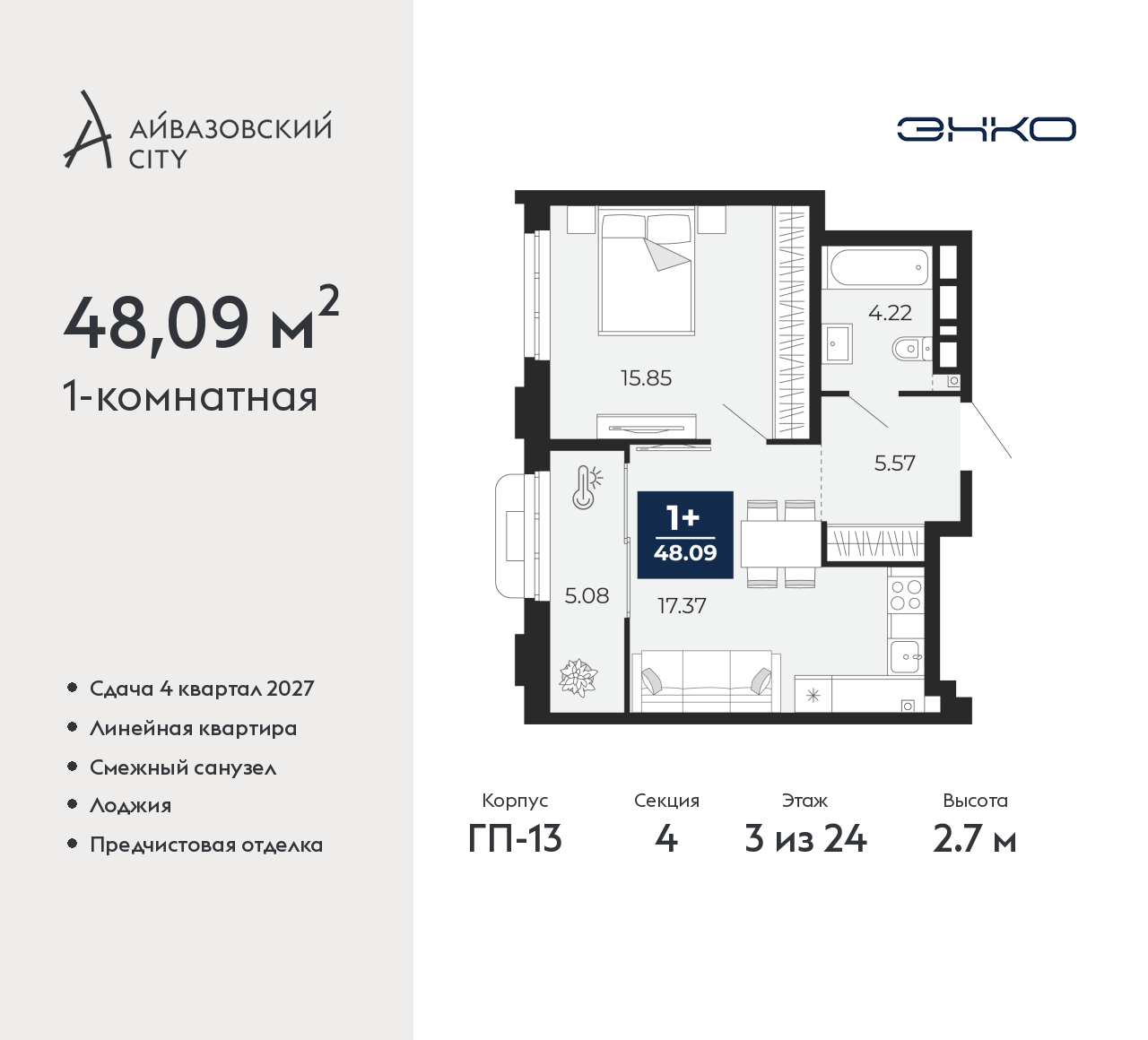 Просторная 1-комн. квартира с предчистовой отделкой в ЖК "Айвазовский City" на 3 этаже. Общая площадь: 48.09 кв.м., жилая: 15.85 кв.м., площадь просторной кухни-столовой: 17.37 кв.м. Все окна выходят на одну сторону. В квартире одна лоджия, один совмещенный санузел. Высота потолков 2.7 м. Дом монолитный, многоподъездный, высотой 24 этажа. Квартира находится в 4-й секции в корпусе ГП-13. На этаже 6 квартир. В подъезде 1 пассажирский и 1 грузовой лифт. Окончание строительства - 4 квартал 2027 года. Оформление сделки по договору долевого участия. Новый жилой район располагается в живописном месте на берегу Туры в центральной части города. Принципиально новое пространство для жизни в центре современного города для тех, чьи мечты сбываются, кто нацелен на постоянный рост, перемены к лучшему для себя и своих близких. Каждая деталь Айвазовский City вдохновляет и заряжает на новые свершения: авторская архитектура, сбалансированная продуманная инфраструктура, дизайнерские дворы со спортивными и детскими площадками, парковые зоны с фонтанами, водный канал, украшающий центральный прогулочный маршрут района и многое другое. В 2019 года проект стал лауреатом престижной премии Urban Awards 2019 в номинации «Лучший строящийся региональный жилой комплекс бизнес-класса». Главная особенность Айвазовский City - соседство разных архитектурных школ в рамках одного дома. Изысканная классика, выразительная эклектика и оригинальный модерн - жить в одном из таких домов настоящий повод для гордости. Айвазовский City это идеальное сочетание комфорта, технологий и развитой инфраструктуры. Вход в подъезд возможен с улицы и со двора. Отправляясь на работу или за покупками, жители могут выйти с внешней стороны дома, а для прогулки с ребенком – со стороны двора. Экологически чистые материалы и энергосберегающие технологии, качественное освещение общественных зон, видеонаблюдение по всей территории жилого района (в том числе в подъездах, лифтах и в подземном паркинге), закрытые дворы с доступом только для жителей Айвазовский City. Часть домов в Айвазовский City будут оснащены подземным паркингом. Востребованный в нашем климатическом поясе формат хранения автомобилей защитит собственность владельца в любое время года. Аккредитация в банках: «Сбербанк России», ПАО Банк «ВТБ», ПАО «Газпромбанк», ОАО «Альфа-Банк», АО "ДОМ.РФ" и других. (AQID02525648)