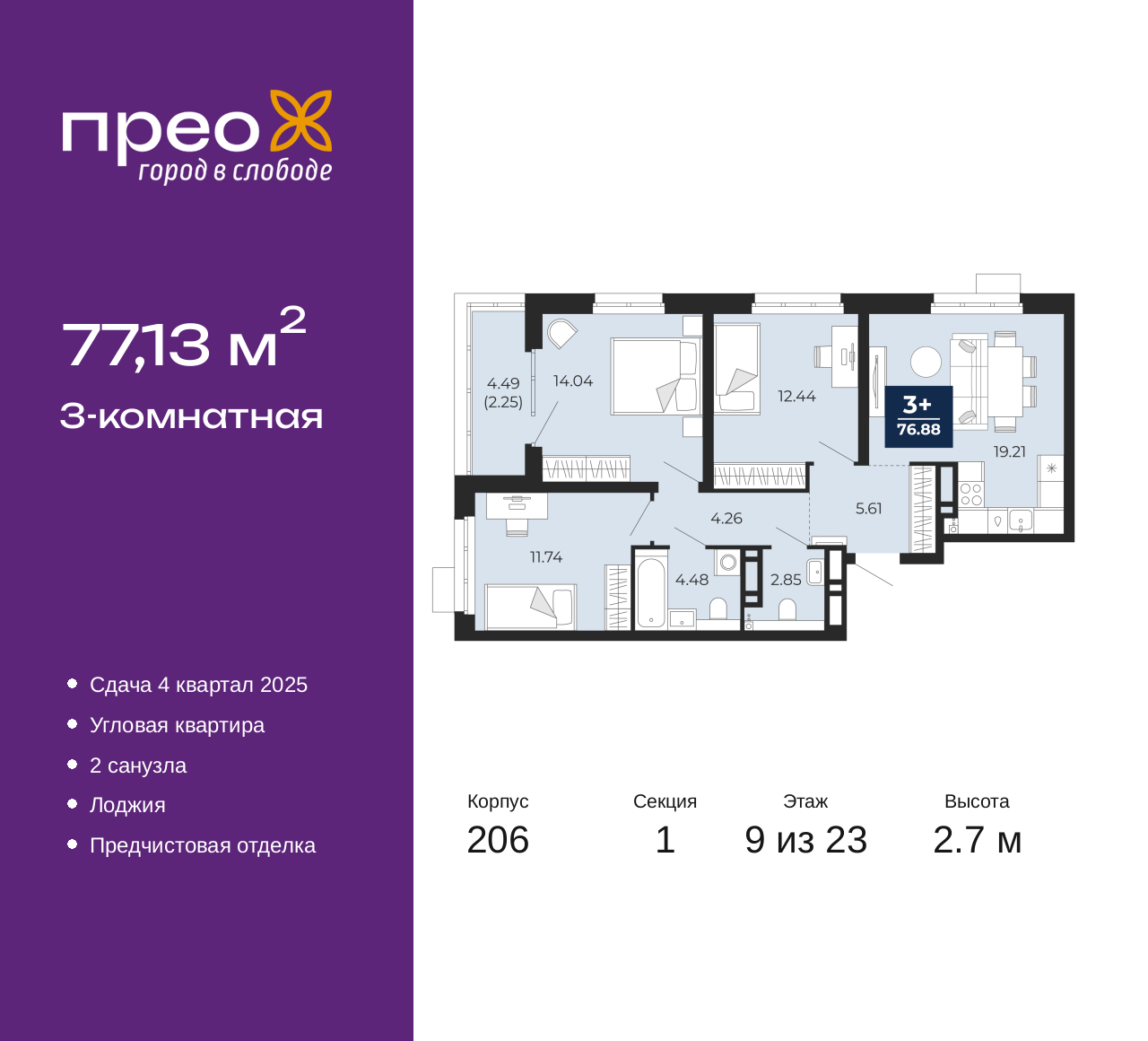 Просторная трехкомнатная квартира с предчистовой отделкой в ЖК "Прео" на 9 этаже. Общая площадь: 77.13 кв.м., жилая: 38.22 кв.м., площадь просторной кухни-столовой: 19.21 кв.м. Квартира угловая, окна oбecпeчивaют paвнoмepнoe ocвeщeниe в тeчeниe дня. В квартире одна лоджия, один совмещенный и один раздельный санузел. Высота потолков 2.7 м. Дом монолитный, трехподъездный, переменной этажности, от 14 до 23 этажей. Квартира находится в 1-й секции высотой 23 этажа в корпусе 206. На этаже 8 квартир. В подъезде 1 пассажирский и 1 грузовой лифт. Окончание строительства - 4 квартал 2025 года. Оформление сделки по договору долевого участия. Преображенский — один из самых привлекательных районов для жизни! Это полностью самостоятельный жилой район с точки зрения инфраструктуры. Преображенский находится между Московским и Червишевским трактами в квартале улиц Закалужская — Вьюжная — Александра Протозанова. Не нужно ждать, когда появится инфраструктура — переезжайте на всё готовое. Вблизи расположены действующие школа и детский сад. В этом году откроется еще один сад, а в следующем году — школа. По соседству с Преображенским запланировано строительство городского парка «Комарово» площадью 38 гектар. За 10 минут можно доехать на автомобиле до крупных ТРЦ: «Лента», «Кристалл», «Леруа Мерлен», «Метро» и «Ашан». С 2018 года в районе открыт Соседский центр — пространство, созданное для формирования добрососедской среды, совместного досуга, общения и реализации соседских инициатив. Здесь проходят встречи соседей, а также сами жители района организовывают мероприятия. Организатором такого события может стать любой желающий. В квартирах выполнена качественная предчистовая отделка. Гладкие стены с финишным выравниванием по маякам. Ровный потолок для установки натяжного потолка. Установлены пятикамерные окна с двойным стеклопакетом (3 стекла). Дизайнерские холлы с видеонаблюдением, безбарьерным и прозрачным входом – всегда светло и спокойно. На первом этаже есть просторные колясочные, где все жители могут оставлять свои коляски и велосипеды. В Преображенском есть всё, что нужно для активного отдыха и занятий спортом. Мы сделали большое футбольное поле с безопасным покрытием. Также установили хоккейный корт, который оборудован по всем необходимым стандартам. Во дворах можно делать упражнения на специальных площадках с турниками. Весь район мы обустроили велодорожками, которые связаны в единый маршрут. У нас есть сухие фонтаны, бьющие из земли, деревья, веревки, сетки, скалодром, газон, песок и резинка — осталось просто дать своему ребенку право на свободную игру. По-настоящему хорошие дворы — это те, которые дети предпочитают соцсетям и телевизору. Аккредитация в банках: ПАО Банк «ВТБ», ПАО «Газпромбанк», ПАО «Банк Уралсиб», «Сбербанк России», ОАО «Альфа-Банк» и других. (AQID02488199)