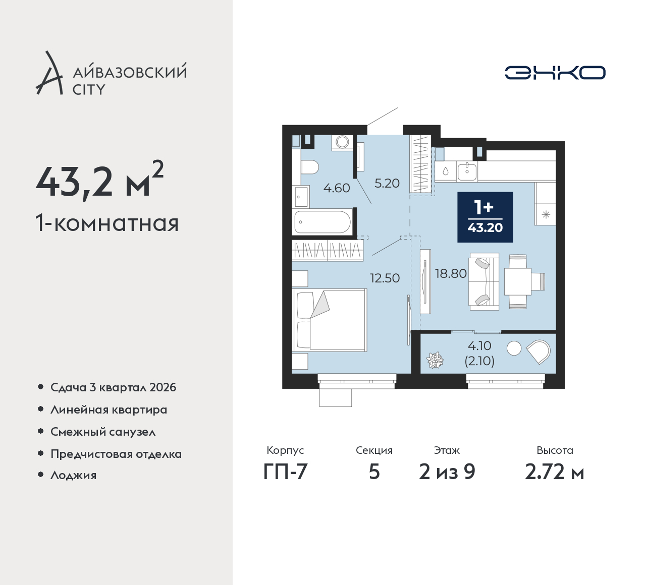 1-комн. квартира от застройщика с предчистовой отделкой в ЖК "Айвазовский City" на 2 этаже. Общая площадь: 43.2 кв.м., жилая: 12.5 кв.м., площадь просторной кухни-столовой: 18.8 кв.м. Все окна выходят на одну сторону. В квартире одна лоджия, один совмещенный санузел. Высота потолков 2.72 м. Дом монолитный, многоподъездный, переменной этажности, от 9 до 24 этажей. Квартира находится в 5-й секции высотой 9 этажей в корпусе ГП-7. На этаже 7 квартир. В подъезде 1 пассажирский и 2 грузовых лифта. Окончание строительства - 3 квартал 2026 года. Оформление сделки по договору долевого участия. Новый жилой район располагается в живописном месте на берегу Туры в центральной части города. Принципиально новое пространство для жизни в центре современного города для тех, чьи мечты сбываются, кто нацелен на постоянный рост, перемены к лучшему для себя и своих близких. Каждая деталь Айвазовский City вдохновляет и заряжает на новые свершения: авторская архитектура, сбалансированная продуманная инфраструктура, дизайнерские дворы со спортивными и детскими площадками, парковые зоны с фонтанами, водный канал, украшающий центральный прогулочный маршрут района и многое другое. В 2019 года проект стал лауреатом престижной премии Urban Awards 2019 в номинации «Лучший строящийся региональный жилой комплекс бизнес-класса». Главная особенность Айвазовский City - соседство разных архитектурных школ в рамках одного дома. Изысканная классика, выразительная эклектика и оригинальный модерн - жить в одном из таких домов настоящий повод для гордости. Айвазовский City это идеальное сочетание комфорта, технологий и развитой инфраструктуры. Вход в подъезд возможен с улицы и со двора. Отправляясь на работу или за покупками, жители могут выйти с внешней стороны дома, а для прогулки с ребенком – со стороны двора. Экологически чистые материалы и энергосберегающие технологии, качественное освещение общественных зон, видеонаблюдение по всей территории жилого района (в том числе в подъездах, лифтах и в подземном паркинге), закрытые дворы с доступом только для жителей Айвазовский City. Часть домов в Айвазовский City будут оснащены подземным паркингом. Востребованный в нашем климатическом поясе формат хранения автомобилей защитит собственность владельца в любое время года. Аккредитация в банках: ПАО «Газпромбанк», ОАО «Альфа-Банк», ПАО Банк «ВТБ», «Сбербанк России», ПАО «Совкомбанк» и других. (AQID02343188)
