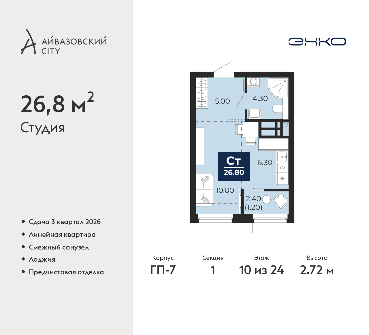 1-комн. квартира-студия с предчистовой отделкой в ЖК "Айвазовский City" на 10 этаже. Общая площадь: 26.8 кв.м., площадь гостиной 17.1 кв.м., из которых 6.7 кв.м. выделено под кухонную зону. Все окна выходят на одну сторону. В квартире одна лоджия, один совмещенный санузел. Высота потолков 2.72 м. Дом монолитный, многоподъездный, переменной этажности, от 9 до 24 этажей. Квартира находится в 1-й секции высотой 24 этажа в корпусе ГП-7. На этаже 6 квартир. В подъезде 1 пассажирский и 2 грузовых лифта. Окончание строительства - 3 квартал 2026 года. Оформление сделки по договору долевого участия. Новый жилой район располагается в живописном месте на берегу Туры в центральной части города. Принципиально новое пространство для жизни в центре современного города для тех, чьи мечты сбываются, кто нацелен на постоянный рост, перемены к лучшему для себя и своих близких. Каждая деталь Айвазовский City вдохновляет и заряжает на новые свершения: авторская архитектура, сбалансированная продуманная инфраструктура, дизайнерские дворы со спортивными и детскими площадками, парковые зоны с фонтанами, водный канал, украшающий центральный прогулочный маршрут района и многое другое. В 2019 года проект стал лауреатом престижной премии Urban Awards 2019 в номинации «Лучший строящийся региональный жилой комплекс бизнес-класса». Главная особенность Айвазовский City - соседство разных архитектурных школ в рамках одного дома. Изысканная классика, выразительная эклектика и оригинальный модерн - жить в одном из таких домов настоящий повод для гордости. Айвазовский City это идеальное сочетание комфорта, технологий и развитой инфраструктуры. Вход в подъезд возможен с улицы и со двора. Отправляясь на работу или за покупками, жители могут выйти с внешней стороны дома, а для прогулки с ребенком – со стороны двора. Экологически чистые материалы и энергосберегающие технологии, качественное освещение общественных зон, видеонаблюдение по всей территории жилого района (в том числе в подъездах, лифтах и в подземном паркинге), закрытые дворы с доступом только для жителей Айвазовский City. Часть домов в Айвазовский City будут оснащены подземным паркингом. Востребованный в нашем климатическом поясе формат хранения автомобилей защитит собственность владельца в любое время года. Аккредитация в банках: ПАО Банк «ВТБ», «Сбербанк России», ПАО «Газпромбанк», ОАО «Альфа-Банк», ПАО Банк «ФК Открытие» и других. (AQID02483552)