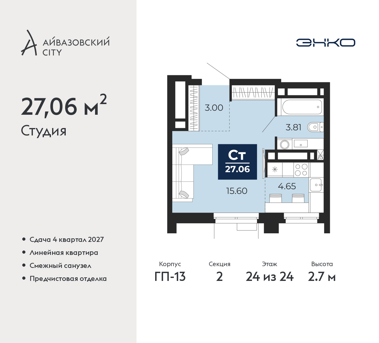 Просторная 1-комн. квартира-студия с предчистовой отделкой в ЖК "Айвазовский City" на 24 этаже. Общая площадь: 27.06 кв.м., площадь гостиной 20.25 кв.м., из которых 4.65 кв.м. выделено под кухонную зону. Все окна выходят на одну сторону. В квартире один совмещенный санузел. Высота потолков 2.7 м. Дом монолитный, многоподъездный, высотой 24 этажа. Квартира находится во 2-й секции в корпусе ГП-13. На этаже 6 квартир. В подъезде 1 пассажирский и 1 грузовой лифт. Окончание строительства - 4 квартал 2027 года. Оформление сделки по договору долевого участия. Новый жилой район располагается в живописном месте на берегу Туры в центральной части города. Принципиально новое пространство для жизни в центре современного города для тех, чьи мечты сбываются, кто нацелен на постоянный рост, перемены к лучшему для себя и своих близких. Каждая деталь Айвазовский City вдохновляет и заряжает на новые свершения: авторская архитектура, сбалансированная продуманная инфраструктура, дизайнерские дворы со спортивными и детскими площадками, парковые зоны с фонтанами, водный канал, украшающий центральный прогулочный маршрут района и многое другое. В 2019 года проект стал лауреатом престижной премии Urban Awards 2019 в номинации «Лучший строящийся региональный жилой комплекс бизнес-класса». Главная особенность Айвазовский City - соседство разных архитектурных школ в рамках одного дома. Изысканная классика, выразительная эклектика и оригинальный модерн - жить в одном из таких домов настоящий повод для гордости. Айвазовский City это идеальное сочетание комфорта, технологий и развитой инфраструктуры. Вход в подъезд возможен с улицы и со двора. Отправляясь на работу или за покупками, жители могут выйти с внешней стороны дома, а для прогулки с ребенком – со стороны двора. Экологически чистые материалы и энергосберегающие технологии, качественное освещение общественных зон, видеонаблюдение по всей территории жилого района (в том числе в подъездах, лифтах и в подземном паркинге), закрытые дворы с доступом только для жителей Айвазовский City. Часть домов в Айвазовский City будут оснащены подземным паркингом. Востребованный в нашем климатическом поясе формат хранения автомобилей защитит собственность владельца в любое время года. Аккредитация в банках: ПАО «Газпромбанк», «Сбербанк России», ОАО «Альфа-Банк», ПАО Банк «ВТБ», АО "ДОМ.РФ" и других. (AQID02525517)