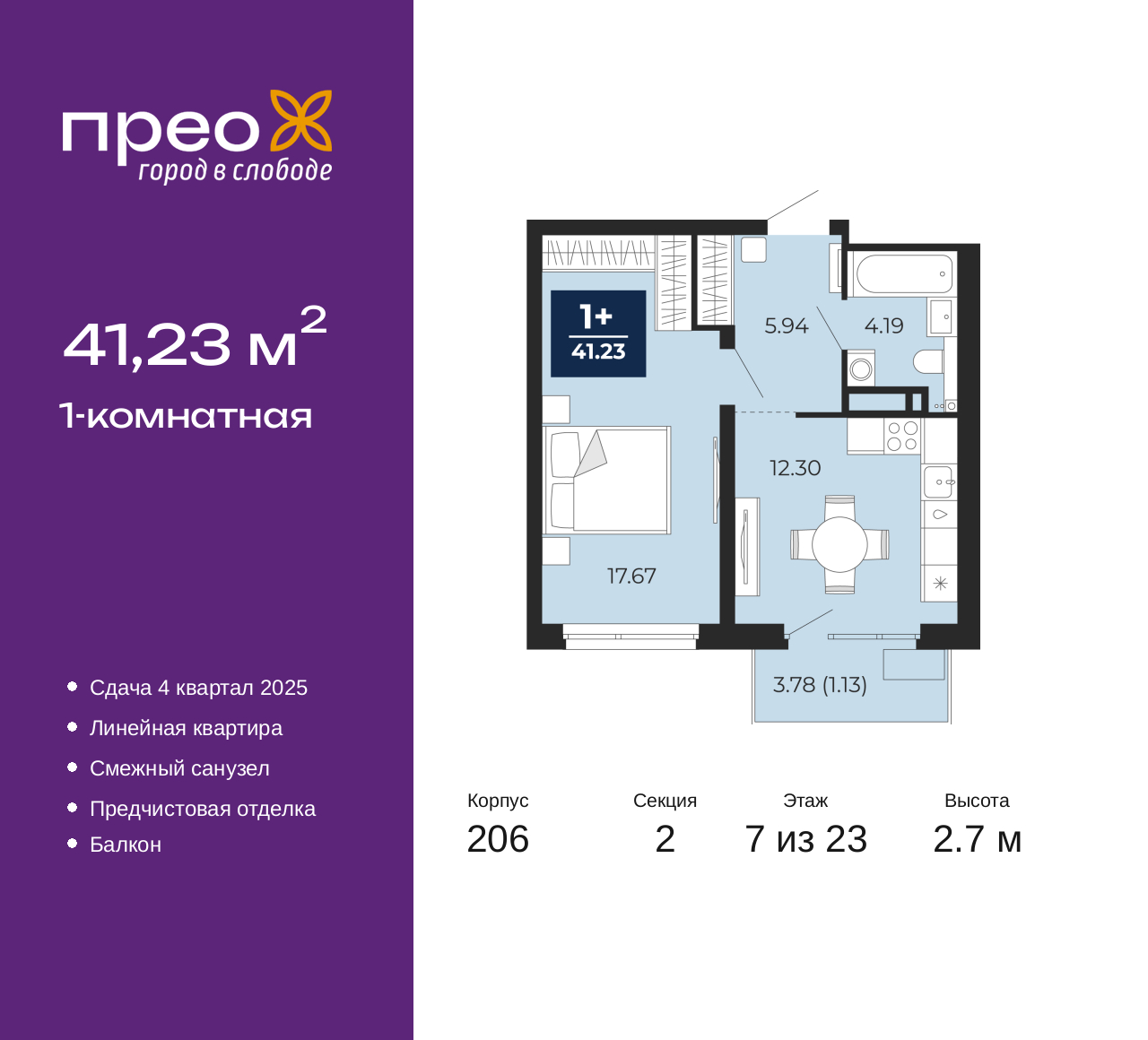 Однокомнатная квартира с предчистовой отделкой в ЖК "Прео" на 7 этаже. Общая площадь: 41.23 кв.м., жилая: 17.67 кв.м., площадь просторной кухни-столовой: 12.3 кв.м. Все окна выходят на одну сторону. В квартире один балкон, один совмещенный санузел. Высота потолков 2.7 м. Дом монолитный, трехподъездный, переменной этажности, от 14 до 23 этажей. Квартира находится во 2-й секции высотой 23 этажа в корпусе 206. На этаже 10 квартир. В подъезде 1 пассажирский и 1 грузовой лифт. Окончание строительства - 4 квартал 2025 года. Оформление сделки по договору долевого участия. Преображенский — один из самых привлекательных районов для жизни! Это полностью самостоятельный жилой район с точки зрения инфраструктуры. Преображенский находится между Московским и Червишевским трактами в квартале улиц Закалужская — Вьюжная — Александра Протозанова. Не нужно ждать, когда появится инфраструктура — переезжайте на всё готовое. Вблизи расположены действующие школа и детский сад. В этом году откроется еще один сад, а в следующем году — школа. По соседству с Преображенским запланировано строительство городского парка «Комарово» площадью 38 гектар. За 10 минут можно доехать на автомобиле до крупных ТРЦ: «Лента», «Кристалл», «Леруа Мерлен», «Метро» и «Ашан». С 2018 года в районе открыт Соседский центр — пространство, созданное для формирования добрососедской среды, совместного досуга, общения и реализации соседских инициатив. Здесь проходят встречи соседей, а также сами жители района организовывают мероприятия. Организатором такого события может стать любой желающий. В квартирах выполнена качественная предчистовая отделка. Гладкие стены с финишным выравниванием по маякам. Ровный потолок для установки натяжного потолка. Установлены пятикамерные окна с двойным стеклопакетом (3 стекла). Дизайнерские холлы с видеонаблюдением, безбарьерным и прозрачным входом – всегда светло и спокойно. На первом этаже есть просторные колясочные, где все жители могут оставлять свои коляски и велосипеды. В Преображенском есть всё, что нужно для активного отдыха и занятий спортом. Мы сделали большое футбольное поле с безопасным покрытием. Также установили хоккейный корт, который оборудован по всем необходимым стандартам. Во дворах можно делать упражнения на специальных площадках с турниками. Весь район мы обустроили велодорожками, которые связаны в единый маршрут. У нас есть сухие фонтаны, бьющие из земли, деревья, веревки, сетки, скалодром, газон, песок и резинка — осталось просто дать своему ребенку право на свободную игру. По-настоящему хорошие дворы — это те, которые дети предпочитают соцсетям и телевизору. Аккредитация в банках: ПАО «Банк Уралсиб», ОАО «Альфа-Банк», ПАО Банк «ВТБ», «Сбербанк России», ПАО «Газпромбанк» и других. (AQID02526647)