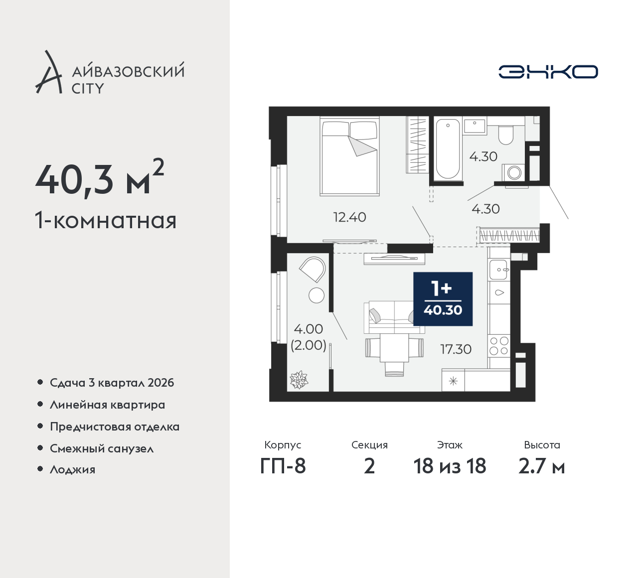Продается однокомнатная квартира с предчистовой отделкой в ЖК "Айвазовский City" на 18 этаже. Общая площадь: 40.3 кв.м., жилая: 12.4 кв.м., площадь просторной кухни-столовой: 17.3 кв.м. Все окна выходят на одну сторону. В квартире одна лоджия, один совмещенный санузел. Высота потолков 2.7 м. Дом монолитный, многоподъездный, переменной этажности, от 14 до 24 этажей. Квартира находится во 2-й секции высотой 18 этажей в корпусе ГП-8. На этаже 5 квартир. В подъезде 1 пассажирский и 1 грузовой лифт. Окончание строительства - 3 квартал 2026 года. Оформление сделки по договору долевого участия. Новый жилой район располагается в живописном месте на берегу Туры в центральной части города. Принципиально новое пространство для жизни в центре современного города для тех, чьи мечты сбываются, кто нацелен на постоянный рост, перемены к лучшему для себя и своих близких. Каждая деталь Айвазовский City вдохновляет и заряжает на новые свершения: авторская архитектура, сбалансированная продуманная инфраструктура, дизайнерские дворы со спортивными и детскими площадками, парковые зоны с фонтанами, водный канал, украшающий центральный прогулочный маршрут района и многое другое. В 2019 года проект стал лауреатом престижной премии Urban Awards 2019 в номинации «Лучший строящийся региональный жилой комплекс бизнес-класса». Главная особенность Айвазовский City - соседство разных архитектурных школ в рамках одного дома. Изысканная классика, выразительная эклектика и оригинальный модерн - жить в одном из таких домов настоящий повод для гордости. Айвазовский City это идеальное сочетание комфорта, технологий и развитой инфраструктуры. Вход в подъезд возможен с улицы и со двора. Отправляясь на работу или за покупками, жители могут выйти с внешней стороны дома, а для прогулки с ребенком – со стороны двора. Экологически чистые материалы и энергосберегающие технологии, качественное освещение общественных зон, видеонаблюдение по всей территории жилого района (в том числе в подъездах, лифтах и в подземном паркинге), закрытые дворы с доступом только для жителей Айвазовский City. Часть домов в Айвазовский City будут оснащены подземным паркингом. Востребованный в нашем климатическом поясе формат хранения автомобилей защитит собственность владельца в любое время года. Аккредитация в банках: ОАО «Альфа-Банк», ПАО Банк «ВТБ», ПАО «Газпромбанк», «Сбербанк России», ПАО «Совкомбанк» и других. (AQID02483714)