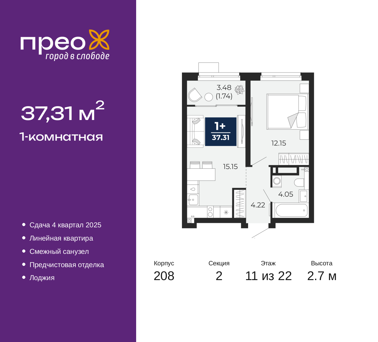 1-комн. квартира от застройщика с предчистовой отделкой в ЖК "Прео" на 11 этаже. Общая площадь: 37.31 кв.м., жилая: 12.15 кв.м., площадь просторной кухни-столовой: 15.15 кв.м. Все окна выходят на одну сторону. В квартире одна лоджия, один совмещенный санузел. Высота потолков 2.7 м. Дом монолитный, трехподъездный, переменной этажности, от 14 до 22 этажей. Квартира находится во 2-й секции высотой 22 этажа в корпусе 208. На этаже 10 квартир. В подъезде 1 пассажирский и 1 грузовой лифт. Окончание строительства - 4 квартал 2025 года. Оформление сделки по договору долевого участия. Преображенский — один из самых привлекательных районов для жизни! Это полностью самостоятельный жилой район с точки зрения инфраструктуры. Преображенский находится между Московским и Червишевским трактами в квартале улиц Закалужская — Вьюжная — Александра Протозанова. Не нужно ждать, когда появится инфраструктура — переезжайте на всё готовое. Вблизи расположены действующие школа и детский сад. В этом году откроется еще один сад, а в следующем году — школа. По соседству с Преображенским запланировано строительство городского парка «Комарово» площадью 38 гектар. За 10 минут можно доехать на автомобиле до крупных ТРЦ: «Лента», «Кристалл», «Леруа Мерлен», «Метро» и «Ашан». С 2018 года в районе открыт Соседский центр — пространство, созданное для формирования добрососедской среды, совместного досуга, общения и реализации соседских инициатив. Здесь проходят встречи соседей, а также сами жители района организовывают мероприятия. Организатором такого события может стать любой желающий. В квартирах выполнена качественная предчистовая отделка. Гладкие стены с финишным выравниванием по маякам. Ровный потолок для установки натяжного потолка. Установлены пятикамерные окна с двойным стеклопакетом (3 стекла). Дизайнерские холлы с видеонаблюдением, безбарьерным и прозрачным входом – всегда светло и спокойно. На первом этаже есть просторные колясочные, где все жители могут оставлять свои коляски и велосипеды. В Преображенском есть всё, что нужно для активного отдыха и занятий спортом. Мы сделали большое футбольное поле с безопасным покрытием. Также установили хоккейный корт, который оборудован по всем необходимым стандартам. Во дворах можно делать упражнения на специальных площадках с турниками. Весь район мы обустроили велодорожками, которые связаны в единый маршрут. У нас есть сухие фонтаны, бьющие из земли, деревья, веревки, сетки, скалодром, газон, песок и резинка — осталось просто дать своему ребенку право на свободную игру. По-настоящему хорошие дворы — это те, которые дети предпочитают соцсетям и телевизору. Аккредитация в банках: ОАО «Альфа-Банк», ПАО «Банк Уралсиб», ПАО «Газпромбанк», ПАО Банк «ВТБ», «Сбербанк России» и других. (AQID02502726)