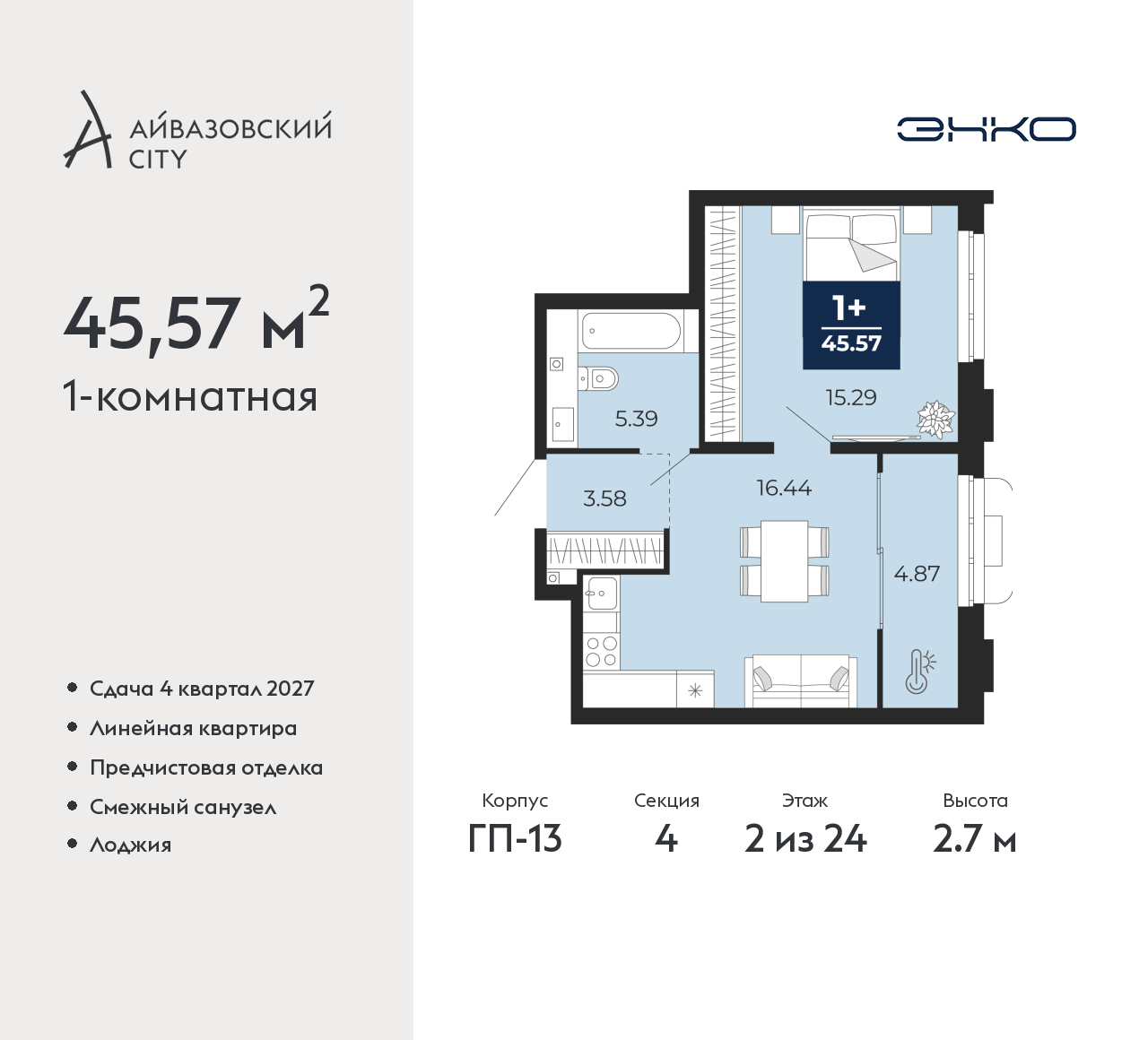 Однокомнатная квартира от застройщика с предчистовой отделкой в ЖК "Айвазовский City" на 2 этаже. Общая площадь: 45.57 кв.м., жилая: 15.29 кв.м., площадь просторной кухни-столовой: 16.44 кв.м. Все окна выходят на одну сторону. В квартире одна лоджия, один совмещенный санузел. Высота потолков 2.7 м. Дом монолитный, многоподъездный, высотой 24 этажа. Квартира находится в 4-й секции в корпусе ГП-13. На этаже 6 квартир. В подъезде 1 пассажирский и 1 грузовой лифт. Окончание строительства - 4 квартал 2027 года. Оформление сделки по договору долевого участия. Новый жилой район располагается в живописном месте на берегу Туры в центральной части города. Принципиально новое пространство для жизни в центре современного города для тех, чьи мечты сбываются, кто нацелен на постоянный рост, перемены к лучшему для себя и своих близких. Каждая деталь Айвазовский City вдохновляет и заряжает на новые свершения: авторская архитектура, сбалансированная продуманная инфраструктура, дизайнерские дворы со спортивными и детскими площадками, парковые зоны с фонтанами, водный канал, украшающий центральный прогулочный маршрут района и многое другое. В 2019 года проект стал лауреатом престижной премии Urban Awards 2019 в номинации «Лучший строящийся региональный жилой комплекс бизнес-класса». Главная особенность Айвазовский City - соседство разных архитектурных школ в рамках одного дома. Изысканная классика, выразительная эклектика и оригинальный модерн - жить в одном из таких домов настоящий повод для гордости. Айвазовский City это идеальное сочетание комфорта, технологий и развитой инфраструктуры. Вход в подъезд возможен с улицы и со двора. Отправляясь на работу или за покупками, жители могут выйти с внешней стороны дома, а для прогулки с ребенком – со стороны двора. Экологически чистые материалы и энергосберегающие технологии, качественное освещение общественных зон, видеонаблюдение по всей территории жилого района (в том числе в подъездах, лифтах и в подземном паркинге), закрытые дворы с доступом только для жителей Айвазовский City. Часть домов в Айвазовский City будут оснащены подземным паркингом. Востребованный в нашем климатическом поясе формат хранения автомобилей защитит собственность владельца в любое время года. Аккредитация в банках: ПАО Банк «ВТБ», «Сбербанк России», ПАО «Газпромбанк», ОАО «Альфа-Банк», ПАО АКБ «Абсолют Банк» и других. (AQID02525574)
