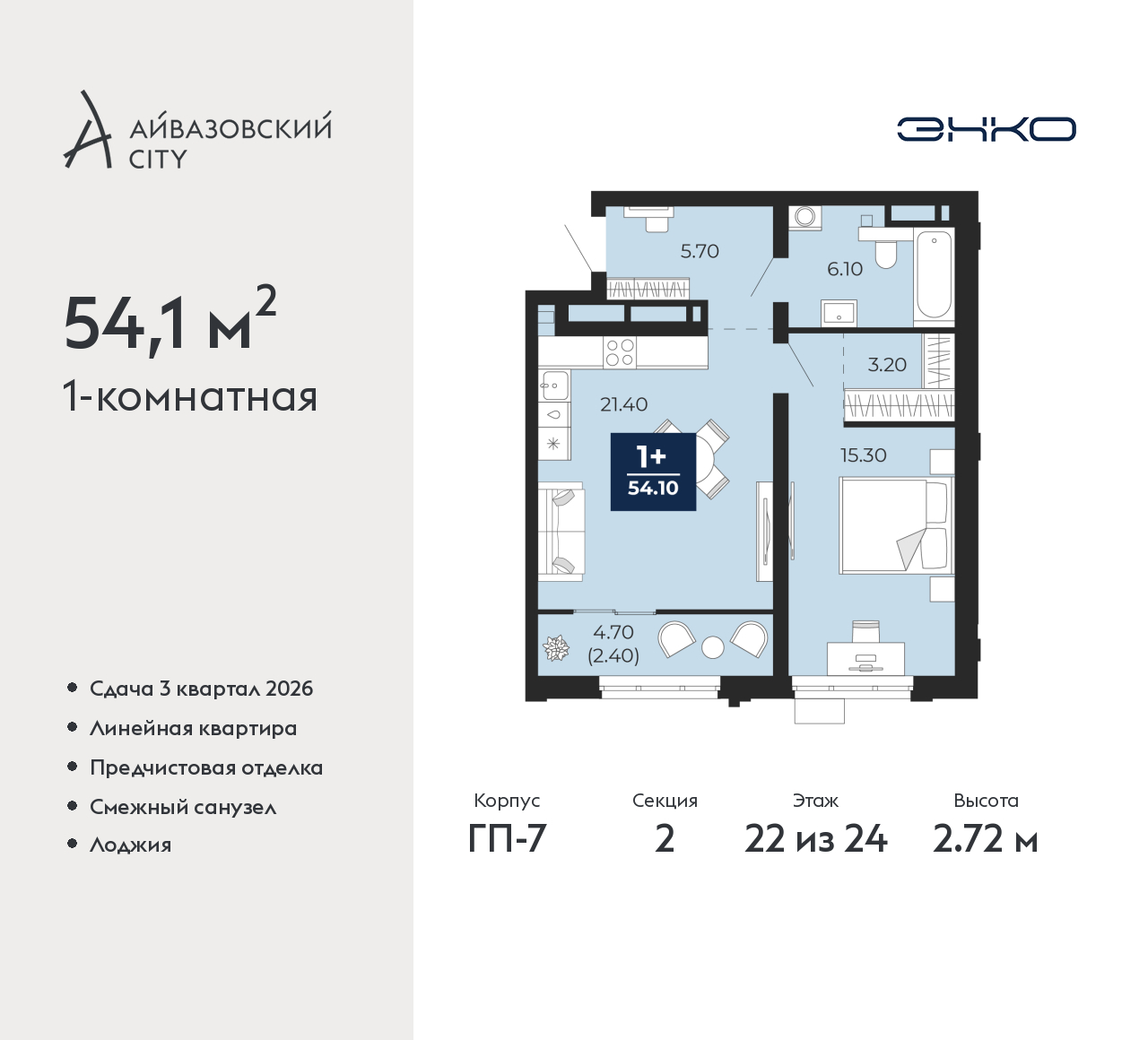 Однокомнатная квартира с предчистовой отделкой в ЖК "Айвазовский City" на 22 этаже. Общая площадь: 54.1 кв.м., жилая: 15.3 кв.м., площадь просторной кухни-столовой: 22 кв.м. Все окна выходят на одну сторону. В квартире одна лоджия, один совмещенный санузел. Высота потолков 2.72 м. Дом монолитный, многоподъездный, переменной этажности, от 9 до 24 этажей. Квартира находится во 2-й секции высотой 24 этажа в корпусе ГП-7. На этаже 7 квартир. В подъезде 1 пассажирский и 2 грузовых лифта. Окончание строительства - 3 квартал 2026 года. Оформление сделки по договору долевого участия. Новый жилой район располагается в живописном месте на берегу Туры в центральной части города. Принципиально новое пространство для жизни в центре современного города для тех, чьи мечты сбываются, кто нацелен на постоянный рост, перемены к лучшему для себя и своих близких. Каждая деталь Айвазовский City вдохновляет и заряжает на новые свершения: авторская архитектура, сбалансированная продуманная инфраструктура, дизайнерские дворы со спортивными и детскими площадками, парковые зоны с фонтанами, водный канал, украшающий центральный прогулочный маршрут района и многое другое. В 2019 года проект стал лауреатом престижной премии Urban Awards 2019 в номинации «Лучший строящийся региональный жилой комплекс бизнес-класса». Главная особенность Айвазовский City - соседство разных архитектурных школ в рамках одного дома. Изысканная классика, выразительная эклектика и оригинальный модерн - жить в одном из таких домов настоящий повод для гордости. Айвазовский City это идеальное сочетание комфорта, технологий и развитой инфраструктуры. Вход в подъезд возможен с улицы и со двора. Отправляясь на работу или за покупками, жители могут выйти с внешней стороны дома, а для прогулки с ребенком – со стороны двора. Экологически чистые материалы и энергосберегающие технологии, качественное освещение общественных зон, видеонаблюдение по всей территории жилого района (в том числе в подъездах, лифтах и в подземном паркинге), закрытые дворы с доступом только для жителей Айвазовский City. Часть домов в Айвазовский City будут оснащены подземным паркингом. Востребованный в нашем климатическом поясе формат хранения автомобилей защитит собственность владельца в любое время года. Аккредитация в банках: ПАО «Газпромбанк», ПАО Банк «ВТБ», ОАО «Альфа-Банк», «Сбербанк России», ПАО «Промсвязьбанк» и других. (AQID02497750)