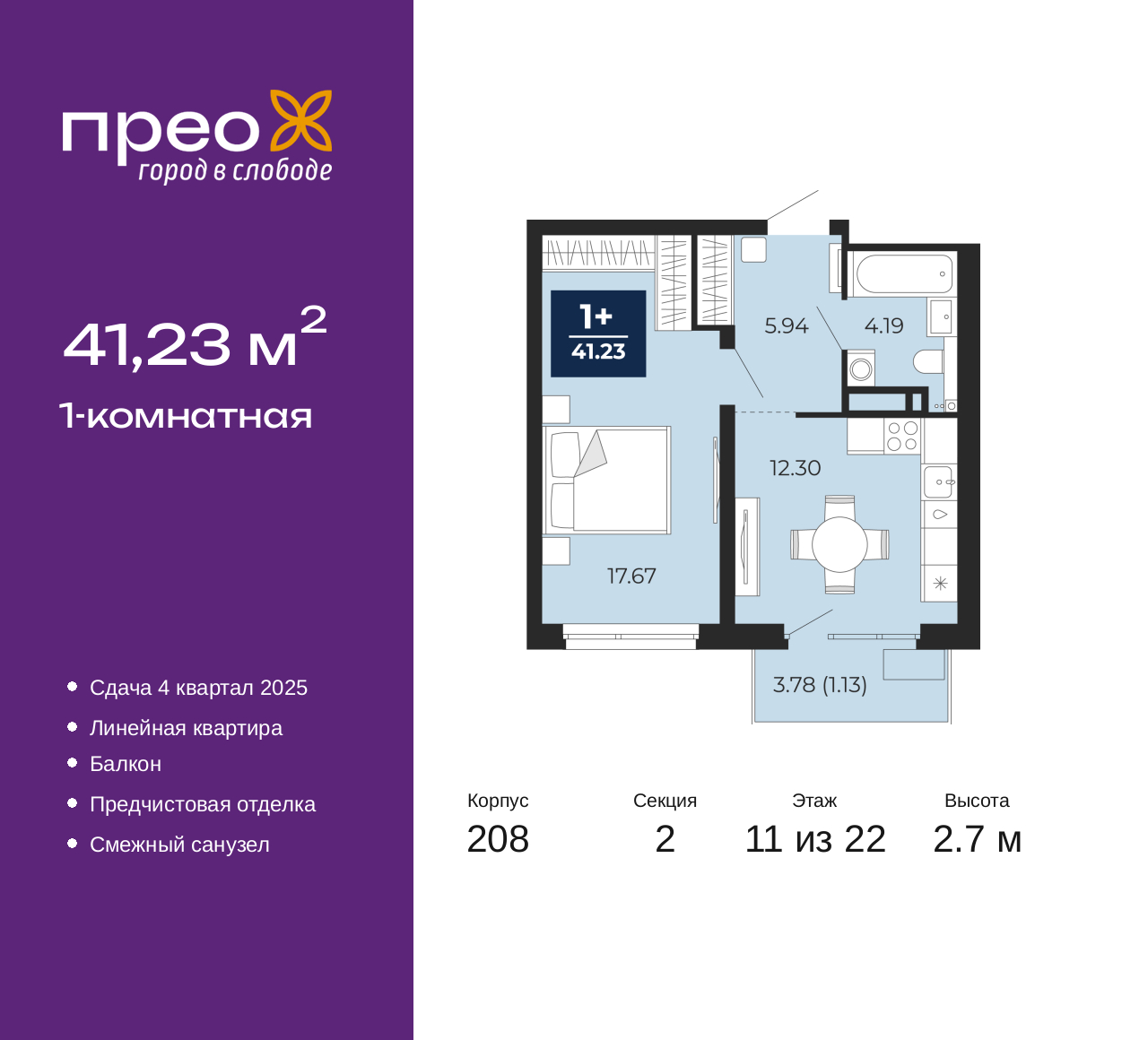 Просторная однокомнатная квартира с предчистовой отделкой в ЖК "Прео" на 11 этаже. Общая площадь: 41.23 кв.м., жилая: 17.67 кв.м., площадь просторной кухни-столовой: 12.3 кв.м. Все окна выходят на одну сторону. В квартире один балкон, один совмещенный санузел. Высота потолков 2.7 м. Дом монолитный, трехподъездный, переменной этажности, от 14 до 22 этажей. Квартира находится во 2-й секции высотой 22 этажа в корпусе 208. На этаже 10 квартир. В подъезде 1 пассажирский и 1 грузовой лифт. Окончание строительства - 4 квартал 2025 года. Оформление сделки по договору долевого участия. Преображенский — один из самых привлекательных районов для жизни! Это полностью самостоятельный жилой район с точки зрения инфраструктуры. Преображенский находится между Московским и Червишевским трактами в квартале улиц Закалужская — Вьюжная — Александра Протозанова. Не нужно ждать, когда появится инфраструктура — переезжайте на всё готовое. Вблизи расположены действующие школа и детский сад. В этом году откроется еще один сад, а в следующем году — школа. По соседству с Преображенским запланировано строительство городского парка «Комарово» площадью 38 гектар. За 10 минут можно доехать на автомобиле до крупных ТРЦ: «Лента», «Кристалл», «Леруа Мерлен», «Метро» и «Ашан». С 2018 года в районе открыт Соседский центр — пространство, созданное для формирования добрососедской среды, совместного досуга, общения и реализации соседских инициатив. Здесь проходят встречи соседей, а также сами жители района организовывают мероприятия. Организатором такого события может стать любой желающий. В квартирах выполнена качественная предчистовая отделка. Гладкие стены с финишным выравниванием по маякам. Ровный потолок для установки натяжного потолка. Установлены пятикамерные окна с двойным стеклопакетом (3 стекла). Дизайнерские холлы с видеонаблюдением, безбарьерным и прозрачным входом – всегда светло и спокойно. На первом этаже есть просторные колясочные, где все жители могут оставлять свои коляски и велосипеды. В Преображенском есть всё, что нужно для активного отдыха и занятий спортом. Мы сделали большое футбольное поле с безопасным покрытием. Также установили хоккейный корт, который оборудован по всем необходимым стандартам. Во дворах можно делать упражнения на специальных площадках с турниками. Весь район мы обустроили велодорожками, которые связаны в единый маршрут. У нас есть сухие фонтаны, бьющие из земли, деревья, веревки, сетки, скалодром, газон, песок и резинка — осталось просто дать своему ребенку право на свободную игру. По-настоящему хорошие дворы — это те, которые дети предпочитают соцсетям и телевизору. Аккредитация в банках: ПАО «Газпромбанк», ПАО «Банк Уралсиб», «Сбербанк России», ОАО «Альфа-Банк», ПАО Банк «ВТБ» и других. (AQID02526654)