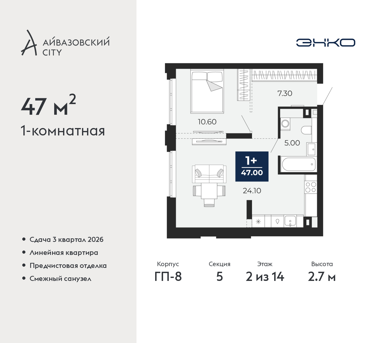 - Общая площадь 47 м²