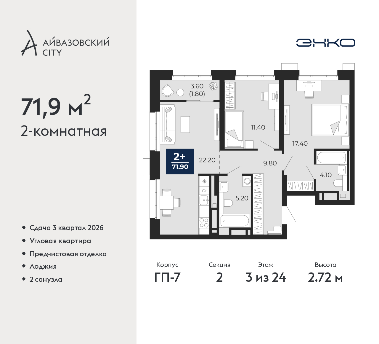 Просторная 2-комн. квартира с предчистовой отделкой в ЖК "Айвазовский City" на 3 этаже. Общая площадь: 71.9 кв.м., жилая: 28.8 кв.м., площадь просторной кухни-столовой: 22.2 кв.м. Квартира угловая, очень светлая, естественная вентиляция при открытии окон. В квартире одна лоджия, два совмещенных санузла. Высота потолков 2.72 м. Дом монолитный, многоподъездный, переменной этажности, от 9 до 24 этажей. Квартира находится во 2-й секции высотой 24 этажа в корпусе ГП-7. На этаже 7 квартир. В подъезде 1 пассажирский и 2 грузовых лифта. Окончание строительства - 3 квартал 2026 года. Оформление сделки по договору долевого участия. Новый жилой район располагается в живописном месте на берегу Туры в центральной части города. Принципиально новое пространство для жизни в центре современного города для тех, чьи мечты сбываются, кто нацелен на постоянный рост, перемены к лучшему для себя и своих близких. Каждая деталь Айвазовский City вдохновляет и заряжает на новые свершения: авторская архитектура, сбалансированная продуманная инфраструктура, дизайнерские дворы со спортивными и детскими площадками, парковые зоны с фонтанами, водный канал, украшающий центральный прогулочный маршрут района и многое другое. В 2019 года проект стал лауреатом престижной премии Urban Awards 2019 в номинации «Лучший строящийся региональный жилой комплекс бизнес-класса». Главная особенность Айвазовский City - соседство разных архитектурных школ в рамках одного дома. Изысканная классика, выразительная эклектика и оригинальный модерн - жить в одном из таких домов настоящий повод для гордости. Айвазовский City это идеальное сочетание комфорта, технологий и развитой инфраструктуры. Вход в подъезд возможен с улицы и со двора. Отправляясь на работу или за покупками, жители могут выйти с внешней стороны дома, а для прогулки с ребенком – со стороны двора. Экологически чистые материалы и энергосберегающие технологии, качественное освещение общественных зон, видеонаблюдение по всей территории жилого района (в том числе в подъездах, лифтах и в подземном паркинге), закрытые дворы с доступом только для жителей Айвазовский City. Часть домов в Айвазовский City будут оснащены подземным паркингом. Востребованный в нашем климатическом поясе формат хранения автомобилей защитит собственность владельца в любое время года. Аккредитация в банках: ОАО «Альфа-Банк», ПАО «Газпромбанк», «Сбербанк России», ПАО Банк «ВТБ», АО "ДОМ.РФ" и других. (AQID02483570)