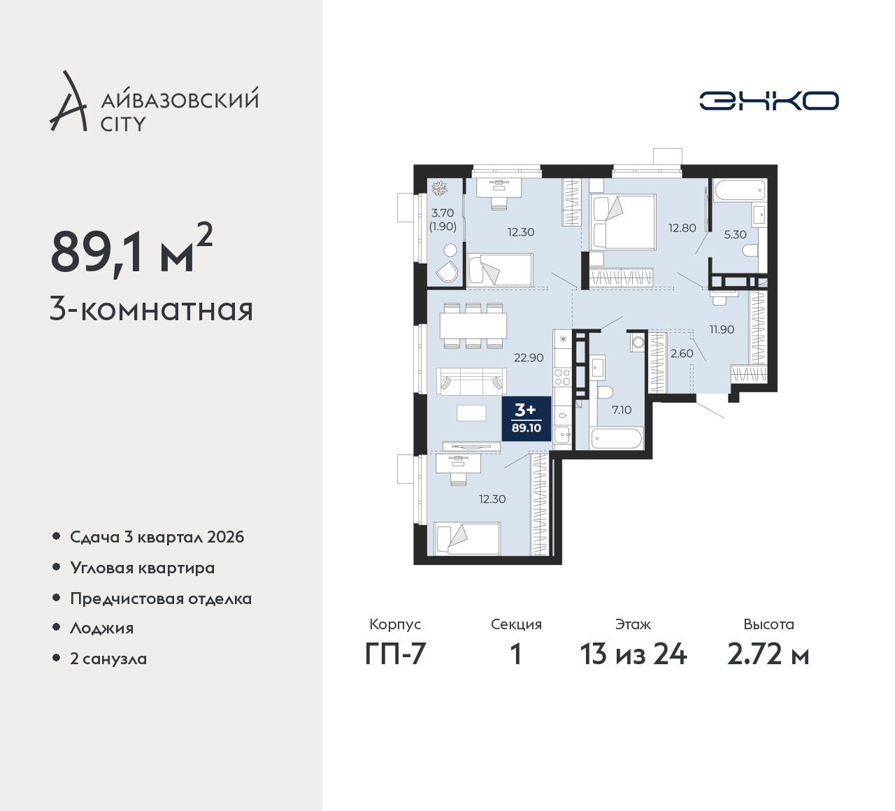 Просторная 3-комн. квартира с предчистовой отделкой в ЖК "Айвазовский City" на 13 этаже. Общая площадь: 89.1 кв.м., жилая: 37.4 кв.м., площадь просторной кухни-столовой: 22.9 кв.м. Угловая квартира, окна oбecпeчивaют paвнoмepнoe ocвeщeниe в тeчeниe дня. В квартире одна лоджия, два совмещенных санузла. Высота потолков 2.72 м. Дом монолитный, многоподъездный, переменной этажности, от 9 до 24 этажей. Квартира находится в 1-й секции высотой 24 этажа в корпусе ГП-7. На этаже 6 квартир. В подъезде 1 пассажирский и 2 грузовых лифта. Окончание строительства - 3 квартал 2026 года. Оформление сделки по договору долевого участия. Новый жилой район располагается в живописном месте на берегу Туры в центральной части города. Принципиально новое пространство для жизни в центре современного города для тех, чьи мечты сбываются, кто нацелен на постоянный рост, перемены к лучшему для себя и своих близких. Каждая деталь Айвазовский City вдохновляет и заряжает на новые свершения: авторская архитектура, сбалансированная продуманная инфраструктура, дизайнерские дворы со спортивными и детскими площадками, парковые зоны с фонтанами, водный канал, украшающий центральный прогулочный маршрут района и многое другое. В 2019 года проект стал лауреатом престижной премии Urban Awards 2019 в номинации «Лучший строящийся региональный жилой комплекс бизнес-класса». Главная особенность Айвазовский City - соседство разных архитектурных школ в рамках одного дома. Изысканная классика, выразительная эклектика и оригинальный модерн - жить в одном из таких домов настоящий повод для гордости. Айвазовский City это идеальное сочетание комфорта, технологий и развитой инфраструктуры. Вход в подъезд возможен с улицы и со двора. Отправляясь на работу или за покупками, жители могут выйти с внешней стороны дома, а для прогулки с ребенком – со стороны двора. Экологически чистые материалы и энергосберегающие технологии, качественное освещение общественных зон, видеонаблюдение по всей территории жилого района (в том числе в подъездах, лифтах и в подземном паркинге), закрытые дворы с доступом только для жителей Айвазовский City. Часть домов в Айвазовский City будут оснащены подземным паркингом. Востребованный в нашем климатическом поясе формат хранения автомобилей защитит собственность владельца в любое время года. Аккредитация в банках: ПАО Банк «ВТБ», ОАО «Альфа-Банк», «Сбербанк России», ПАО «Газпромбанк», ПАО АКБ «Абсолют Банк» и других. (AQID02487902)