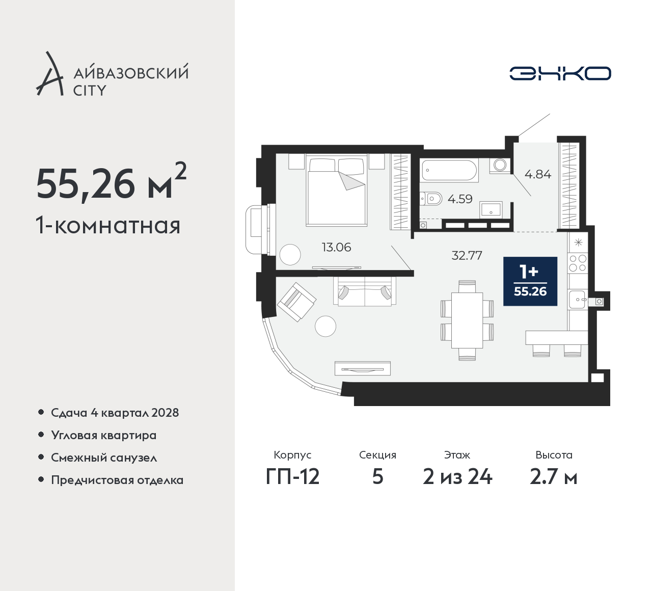 1-комн. квартира от застройщика с предчистовой отделкой в ЖК "Айвазовский City" на 2 этаже. Общая площадь: 55.26 кв.м., жилая: 13.06 кв.м., площадь просторной кухни-столовой: 32.77 кв.м. Угловая квартира, очень светлая, естественная вентиляция при открытии окон. В квартире один совмещенный санузел. Высота потолков 2.7 м. Дом монолитный, многоподъездный, высотой 24 этажа. Квартира находится в 5-й секции в корпусе ГП-12. На этаже 5 квартир. В подъезде 1 пассажирский и 1 грузовой лифт. Окончание строительства - 4 квартал 2028 года. Оформление сделки по договору долевого участия. Новый жилой район располагается в живописном месте на берегу Туры в центральной части города. Принципиально новое пространство для жизни в центре современного города для тех, чьи мечты сбываются, кто нацелен на постоянный рост, перемены к лучшему для себя и своих близких. Каждая деталь Айвазовский City вдохновляет и заряжает на новые свершения: авторская архитектура, сбалансированная продуманная инфраструктура, дизайнерские дворы со спортивными и детскими площадками, парковые зоны с фонтанами, водный канал, украшающий центральный прогулочный маршрут района и многое другое. В 2019 года проект стал лауреатом престижной премии Urban Awards 2019 в номинации «Лучший строящийся региональный жилой комплекс бизнес-класса». Главная особенность Айвазовский City - соседство разных архитектурных школ в рамках одного дома. Изысканная классика, выразительная эклектика и оригинальный модерн - жить в одном из таких домов настоящий повод для гордости. Айвазовский City это идеальное сочетание комфорта, технологий и развитой инфраструктуры. Вход в подъезд возможен с улицы и со двора. Отправляясь на работу или за покупками, жители могут выйти с внешней стороны дома, а для прогулки с ребенком – со стороны двора. Экологически чистые материалы и энергосберегающие технологии, качественное освещение общественных зон, видеонаблюдение по всей территории жилого района (в том числе в подъездах, лифтах и в подземном паркинге), закрытые дворы с доступом только для жителей Айвазовский City. Часть домов в Айвазовский City будут оснащены подземным паркингом. Востребованный в нашем климатическом поясе формат хранения автомобилей защитит собственность владельца в любое время года. Аккредитация в банках: ПАО «Газпромбанк», ОАО «Альфа-Банк», «Сбербанк России», ПАО Банк «ВТБ», ПАО «Совкомбанк» и других. (AQID02525668)
