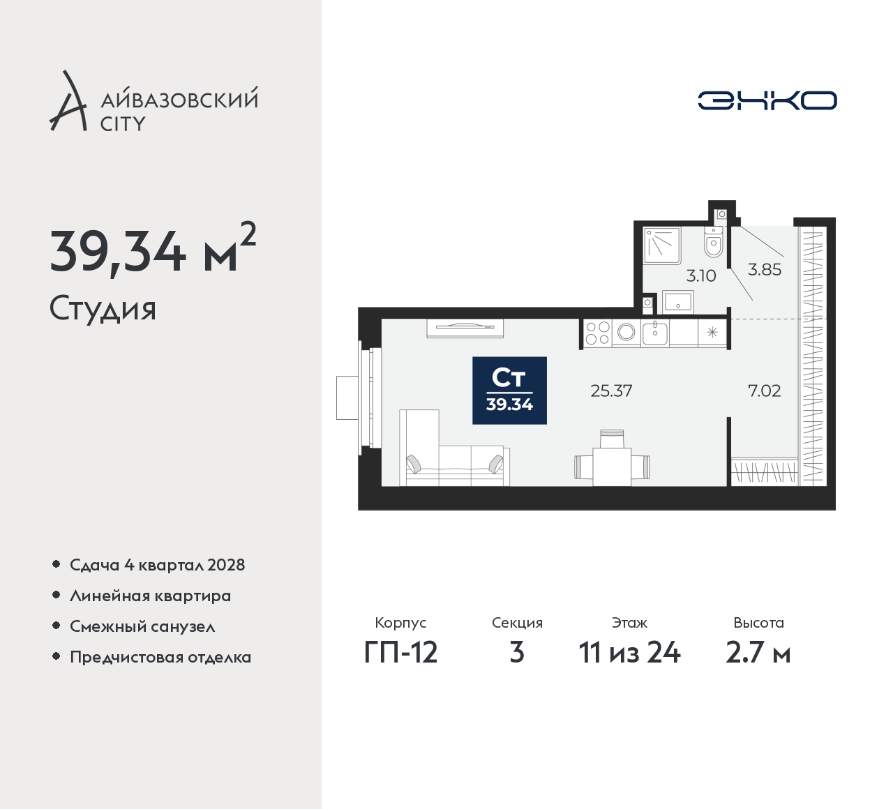 Просторная однокомнатная квартира-студия с предчистовой отделкой в ЖК "Айвазовский City" на 11 этаже. Общая площадь: 39.34 кв.м., площадь гостиной 26.37 кв.м., из которых 6 кв.м. выделено под кухонную зону. Все окна выходят на одну сторону. В квартире один совмещенный санузел. Высота потолков 2.7 м. Дом монолитный, многоподъездный, высотой 24 этажа. Квартира находится в 3-й секции в корпусе ГП-12. На этаже 6 квартир. В подъезде 1 пассажирский и 1 грузовой лифт. Окончание строительства - 4 квартал 2028 года. Оформление сделки по договору долевого участия. Новый жилой район располагается в живописном месте на берегу Туры в центральной части города. Принципиально новое пространство для жизни в центре современного города для тех, чьи мечты сбываются, кто нацелен на постоянный рост, перемены к лучшему для себя и своих близких. Каждая деталь Айвазовский City вдохновляет и заряжает на новые свершения: авторская архитектура, сбалансированная продуманная инфраструктура, дизайнерские дворы со спортивными и детскими площадками, парковые зоны с фонтанами, водный канал, украшающий центральный прогулочный маршрут района и многое другое. В 2019 года проект стал лауреатом престижной премии Urban Awards 2019 в номинации «Лучший строящийся региональный жилой комплекс бизнес-класса». Главная особенность Айвазовский City - соседство разных архитектурных школ в рамках одного дома. Изысканная классика, выразительная эклектика и оригинальный модерн - жить в одном из таких домов настоящий повод для гордости. Айвазовский City это идеальное сочетание комфорта, технологий и развитой инфраструктуры. Вход в подъезд возможен с улицы и со двора. Отправляясь на работу или за покупками, жители могут выйти с внешней стороны дома, а для прогулки с ребенком – со стороны двора. Экологически чистые материалы и энергосберегающие технологии, качественное освещение общественных зон, видеонаблюдение по всей территории жилого района (в том числе в подъездах, лифтах и в подземном паркинге), закрытые дворы с доступом только для жителей Айвазовский City. Часть домов в Айвазовский City будут оснащены подземным паркингом. Востребованный в нашем климатическом поясе формат хранения автомобилей защитит собственность владельца в любое время года. Аккредитация в банках: «Сбербанк России», ПАО «Газпромбанк», ПАО Банк «ВТБ», ОАО «Альфа-Банк», АО "ДОМ.РФ" и других. (AQID02525550)