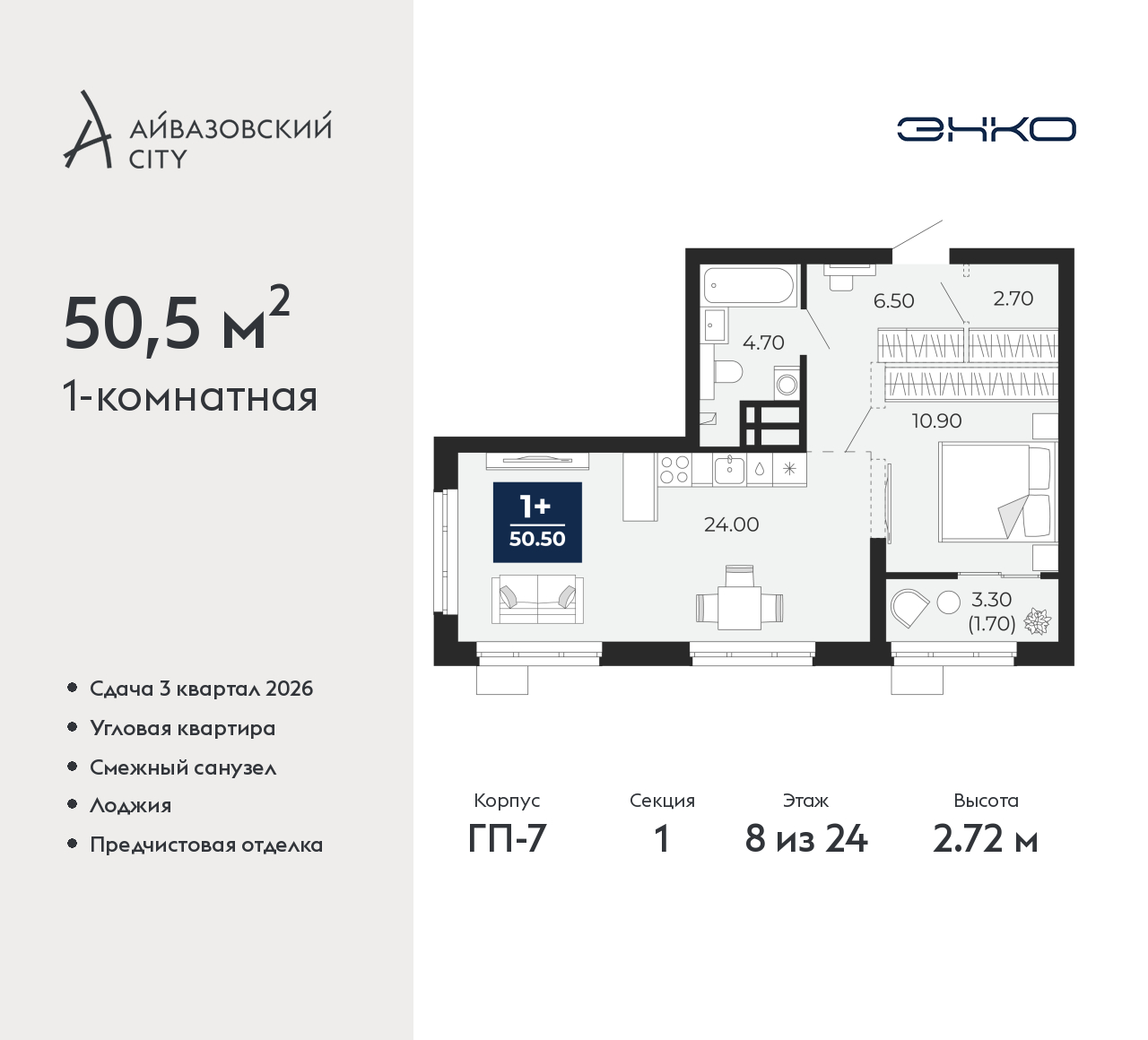 Однокомнатная квартира с предчистовой отделкой в ЖК "Айвазовский City" на 8 этаже. Общая площадь: 50.5 кв.м., жилая: 10.9 кв.м., площадь просторной кухни-столовой: 24 кв.м. Угловая квартира, окна oбecпeчивaют paвнoмepнoe ocвeщeниe в тeчeниe дня. В квартире одна лоджия, один совмещенный санузел. Высота потолков 2.72 м. Дом монолитный, многоподъездный, переменной этажности, от 9 до 24 этажей. Квартира находится в 1-й секции высотой 24 этажа в корпусе ГП-7. На этаже 6 квартир. В подъезде 1 пассажирский и 2 грузовых лифта. Окончание строительства - 3 квартал 2026 года. Оформление сделки по договору долевого участия. Новый жилой район располагается в живописном месте на берегу Туры в центральной части города. Принципиально новое пространство для жизни в центре современного города для тех, чьи мечты сбываются, кто нацелен на постоянный рост, перемены к лучшему для себя и своих близких. Каждая деталь Айвазовский City вдохновляет и заряжает на новые свершения: авторская архитектура, сбалансированная продуманная инфраструктура, дизайнерские дворы со спортивными и детскими площадками, парковые зоны с фонтанами, водный канал, украшающий центральный прогулочный маршрут района и многое другое. В 2019 года проект стал лауреатом престижной премии Urban Awards 2019 в номинации «Лучший строящийся региональный жилой комплекс бизнес-класса». Главная особенность Айвазовский City - соседство разных архитектурных школ в рамках одного дома. Изысканная классика, выразительная эклектика и оригинальный модерн - жить в одном из таких домов настоящий повод для гордости. Айвазовский City это идеальное сочетание комфорта, технологий и развитой инфраструктуры. Вход в подъезд возможен с улицы и со двора. Отправляясь на работу или за покупками, жители могут выйти с внешней стороны дома, а для прогулки с ребенком – со стороны двора. Экологически чистые материалы и энергосберегающие технологии, качественное освещение общественных зон, видеонаблюдение по всей территории жилого района (в том числе в подъездах, лифтах и в подземном паркинге), закрытые дворы с доступом только для жителей Айвазовский City. Часть домов в Айвазовский City будут оснащены подземным паркингом. Востребованный в нашем климатическом поясе формат хранения автомобилей защитит собственность владельца в любое время года. Аккредитация в банках: ПАО «Газпромбанк», ОАО «Альфа-Банк», ПАО Банк «ВТБ», «Сбербанк России», ПАО Банк «ФК Открытие» и других. (AQID02487898)