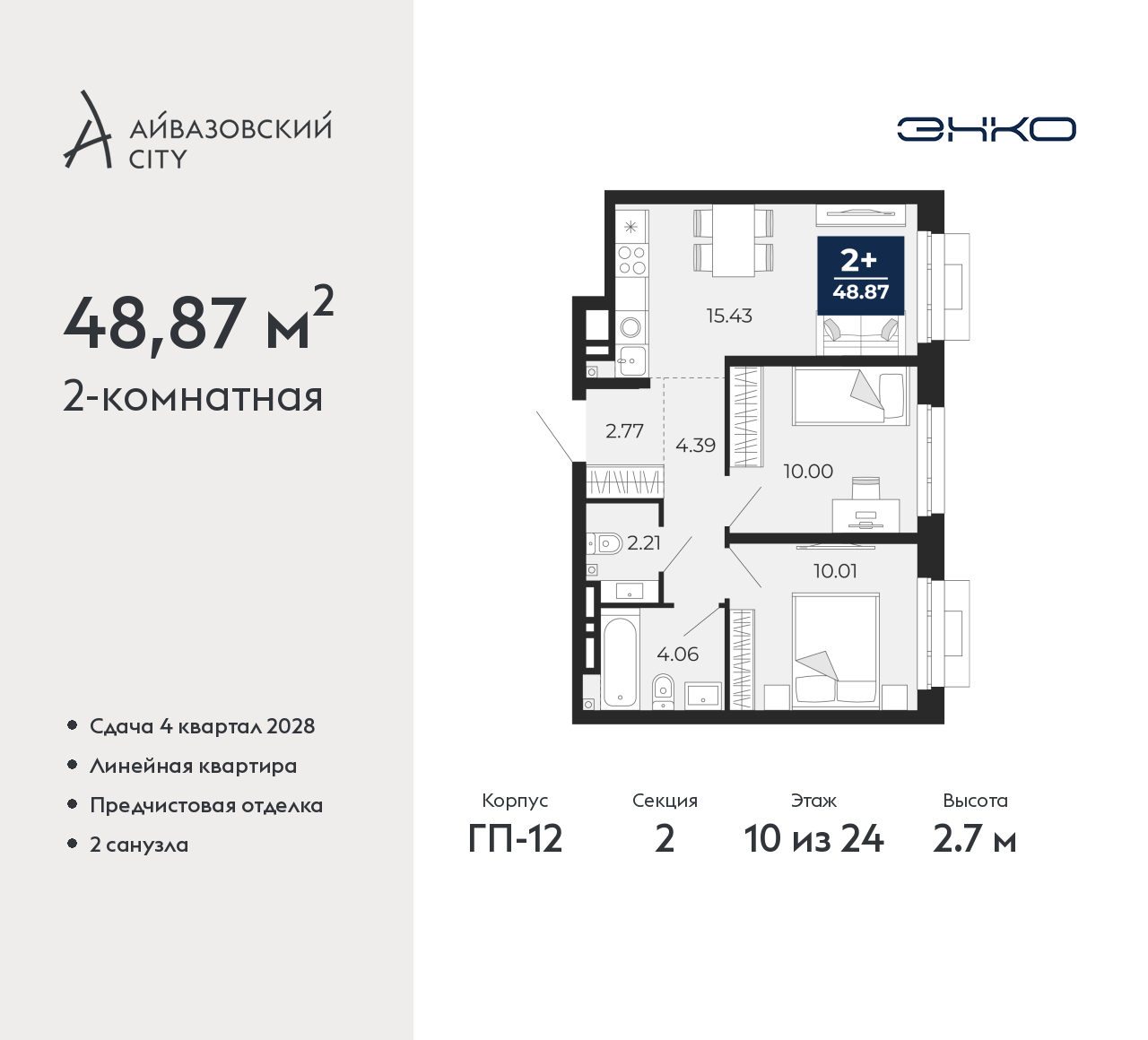 Просторная двухкомнатная квартира с предчистовой отделкой в ЖК "Айвазовский City" на 10 этаже. Общая площадь: 48.87 кв.м., жилая: 20.01 кв.м., площадь просторной кухни-столовой: 15.43 кв.м. Комнаты изолированные, все окна выходят на одну сторону. В квартире один совмещенный и один раздельный санузел. Высота потолков 2.7 м. Дом монолитный, многоподъездный, высотой 24 этажа. Квартира находится во 2-й секции в корпусе ГП-12. На этаже 6 квартир. В подъезде 1 пассажирский и 1 грузовой лифт. Окончание строительства - 4 квартал 2028 года. Оформление сделки по договору долевого участия. Новый жилой район располагается в живописном месте на берегу Туры в центральной части города. Принципиально новое пространство для жизни в центре современного города для тех, чьи мечты сбываются, кто нацелен на постоянный рост, перемены к лучшему для себя и своих близких. Каждая деталь Айвазовский City вдохновляет и заряжает на новые свершения: авторская архитектура, сбалансированная продуманная инфраструктура, дизайнерские дворы со спортивными и детскими площадками, парковые зоны с фонтанами, водный канал, украшающий центральный прогулочный маршрут района и многое другое. В 2019 года проект стал лауреатом престижной премии Urban Awards 2019 в номинации «Лучший строящийся региональный жилой комплекс бизнес-класса». Главная особенность Айвазовский City - соседство разных архитектурных школ в рамках одного дома. Изысканная классика, выразительная эклектика и оригинальный модерн - жить в одном из таких домов настоящий повод для гордости. Айвазовский City это идеальное сочетание комфорта, технологий и развитой инфраструктуры. Вход в подъезд возможен с улицы и со двора. Отправляясь на работу или за покупками, жители могут выйти с внешней стороны дома, а для прогулки с ребенком – со стороны двора. Экологически чистые материалы и энергосберегающие технологии, качественное освещение общественных зон, видеонаблюдение по всей территории жилого района (в том числе в подъездах, лифтах и в подземном паркинге), закрытые дворы с доступом только для жителей Айвазовский City. Часть домов в Айвазовский City будут оснащены подземным паркингом. Востребованный в нашем климатическом поясе формат хранения автомобилей защитит собственность владельца в любое время года. Аккредитация в банках: «Сбербанк России», ПАО «Газпромбанк», ПАО Банк «ВТБ», ОАО «Альфа-Банк», ПАО АКБ «Абсолют Банк» и других. (AQID02525656)