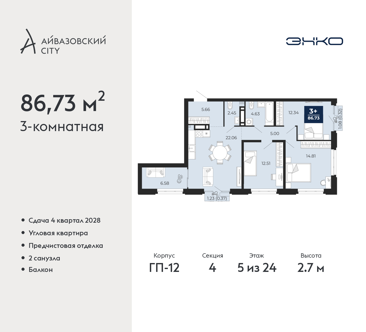 3-комн. квартира от застройщика с предчистовой отделкой в ЖК "Айвазовский City" на 5 этаже. Общая площадь: 86.73 кв.м., жилая: 39.66 кв.м., площадь просторной кухни-столовой: 22.06 кв.м. Квартира угловая, идеально подойдет любителям тишины и панорамных видов. В квартире один балкон, один совмещенный и один раздельный санузел. Высота потолков 2.7 м. Дом монолитный, многоподъездный, высотой 24 этажа. Квартира находится в 4-й секции в корпусе ГП-12. На этаже 5 квартир. В подъезде 1 пассажирский и 1 грузовой лифт. Окончание строительства - 4 квартал 2028 года. Оформление сделки по договору долевого участия. Новый жилой район располагается в живописном месте на берегу Туры в центральной части города. Принципиально новое пространство для жизни в центре современного города для тех, чьи мечты сбываются, кто нацелен на постоянный рост, перемены к лучшему для себя и своих близких. Каждая деталь Айвазовский City вдохновляет и заряжает на новые свершения: авторская архитектура, сбалансированная продуманная инфраструктура, дизайнерские дворы со спортивными и детскими площадками, парковые зоны с фонтанами, водный канал, украшающий центральный прогулочный маршрут района и многое другое. В 2019 года проект стал лауреатом престижной премии Urban Awards 2019 в номинации «Лучший строящийся региональный жилой комплекс бизнес-класса». Главная особенность Айвазовский City - соседство разных архитектурных школ в рамках одного дома. Изысканная классика, выразительная эклектика и оригинальный модерн - жить в одном из таких домов настоящий повод для гордости. Айвазовский City это идеальное сочетание комфорта, технологий и развитой инфраструктуры. Вход в подъезд возможен с улицы и со двора. Отправляясь на работу или за покупками, жители могут выйти с внешней стороны дома, а для прогулки с ребенком – со стороны двора. Экологически чистые материалы и энергосберегающие технологии, качественное освещение общественных зон, видеонаблюдение по всей территории жилого района (в том числе в подъездах, лифтах и в подземном паркинге), закрытые дворы с доступом только для жителей Айвазовский City. Часть домов в Айвазовский City будут оснащены подземным паркингом. Востребованный в нашем климатическом поясе формат хранения автомобилей защитит собственность владельца в любое время года. Аккредитация в банках: ОАО «Альфа-Банк», ПАО Банк «ВТБ», «Сбербанк России», ПАО «Газпромбанк», АО "ДОМ.РФ" и других. (AQID02525754)