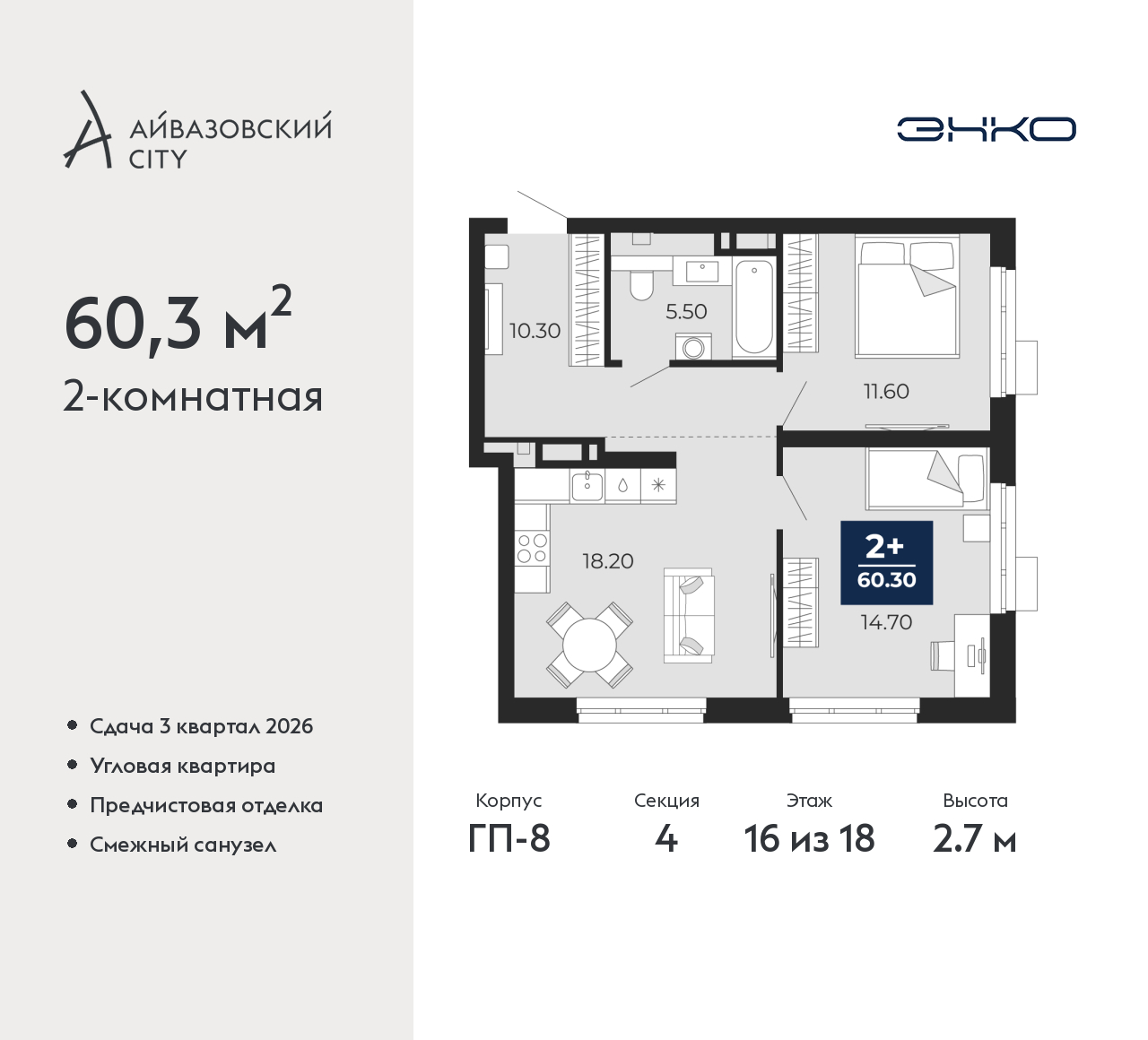 2-комн. квартира с предчистовой отделкой в ЖК "Айвазовский City" на 16 этаже. Общая площадь: 60.3 кв.м., жилая: 26.3 кв.м., площадь просторной кухни-столовой: 18.2 кв.м. Угловая квартира, окна oбecпeчивaют paвнoмepнoe ocвeщeниe в тeчeниe дня. В квартире один совмещенный санузел. Высота потолков 2.7 м. Дом монолитный, многоподъездный, переменной этажности, от 14 до 24 этажей. Квартира находится в 4-й секции высотой 18 этажей в корпусе ГП-8. На этаже 6 квартир. В подъезде 1 пассажирский и 1 грузовой лифт. Окончание строительства - 3 квартал 2026 года. Оформление сделки по договору долевого участия. Новый жилой район располагается в живописном месте на берегу Туры в центральной части города. Принципиально новое пространство для жизни в центре современного города для тех, чьи мечты сбываются, кто нацелен на постоянный рост, перемены к лучшему для себя и своих близких. Каждая деталь Айвазовский City вдохновляет и заряжает на новые свершения: авторская архитектура, сбалансированная продуманная инфраструктура, дизайнерские дворы со спортивными и детскими площадками, парковые зоны с фонтанами, водный канал, украшающий центральный прогулочный маршрут района и многое другое. В 2019 года проект стал лауреатом престижной премии Urban Awards 2019 в номинации «Лучший строящийся региональный жилой комплекс бизнес-класса». Главная особенность Айвазовский City - соседство разных архитектурных школ в рамках одного дома. Изысканная классика, выразительная эклектика и оригинальный модерн - жить в одном из таких домов настоящий повод для гордости. Айвазовский City это идеальное сочетание комфорта, технологий и развитой инфраструктуры. Вход в подъезд возможен с улицы и со двора. Отправляясь на работу или за покупками, жители могут выйти с внешней стороны дома, а для прогулки с ребенком – со стороны двора. Экологически чистые материалы и энергосберегающие технологии, качественное освещение общественных зон, видеонаблюдение по всей территории жилого района (в том числе в подъездах, лифтах и в подземном паркинге), закрытые дворы с доступом только для жителей Айвазовский City. Часть домов в Айвазовский City будут оснащены подземным паркингом. Востребованный в нашем климатическом поясе формат хранения автомобилей защитит собственность владельца в любое время года. Аккредитация в банках: ПАО «Газпромбанк», «Сбербанк России», ПАО Банк «ВТБ», ОАО «Альфа-Банк», ПАО Банк «ФК Открытие» и других. (AQID02453767)