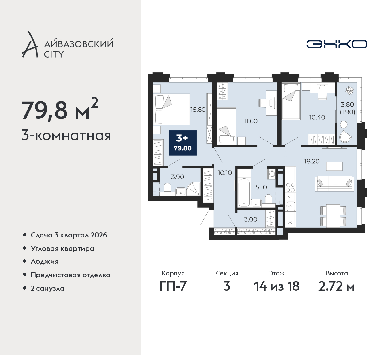 Трехкомнатная квартира с предчистовой отделкой в ЖК "Айвазовский City" на 14 этаже. Общая площадь: 79.8 кв.м., жилая: 37.6 кв.м., площадь просторной кухни-столовой: 18.2 кв.м. Угловая квартира, очень светлая, естественная вентиляция при открытии окон. В квартире одна лоджия, два совмещенных санузла. Высота потолков 2.72 м. Дом монолитный, многоподъездный, переменной этажности, от 9 до 24 этажей. Квартира находится в 3-й секции высотой 18 этажей в корпусе ГП-7. На этаже 5 квартир. В подъезде 1 пассажирский и 2 грузовых лифта. Окончание строительства - 3 квартал 2026 года. Оформление сделки по договору долевого участия. Новый жилой район располагается в живописном месте на берегу Туры в центральной части города. Принципиально новое пространство для жизни в центре современного города для тех, чьи мечты сбываются, кто нацелен на постоянный рост, перемены к лучшему для себя и своих близких. Каждая деталь Айвазовский City вдохновляет и заряжает на новые свершения: авторская архитектура, сбалансированная продуманная инфраструктура, дизайнерские дворы со спортивными и детскими площадками, парковые зоны с фонтанами, водный канал, украшающий центральный прогулочный маршрут района и многое другое. В 2019 года проект стал лауреатом престижной премии Urban Awards 2019 в номинации «Лучший строящийся региональный жилой комплекс бизнес-класса». Главная особенность Айвазовский City - соседство разных архитектурных школ в рамках одного дома. Изысканная классика, выразительная эклектика и оригинальный модерн - жить в одном из таких домов настоящий повод для гордости. Айвазовский City это идеальное сочетание комфорта, технологий и развитой инфраструктуры. Вход в подъезд возможен с улицы и со двора. Отправляясь на работу или за покупками, жители могут выйти с внешней стороны дома, а для прогулки с ребенком – со стороны двора. Экологически чистые материалы и энергосберегающие технологии, качественное освещение общественных зон, видеонаблюдение по всей территории жилого района (в том числе в подъездах, лифтах и в подземном паркинге), закрытые дворы с доступом только для жителей Айвазовский City. Часть домов в Айвазовский City будут оснащены подземным паркингом. Востребованный в нашем климатическом поясе формат хранения автомобилей защитит собственность владельца в любое время года. Аккредитация в банках: ПАО «Газпромбанк», ОАО «Альфа-Банк», ПАО Банк «ВТБ», «Сбербанк России», ПАО АКБ «Абсолют Банк» и других. (AQID02497832)