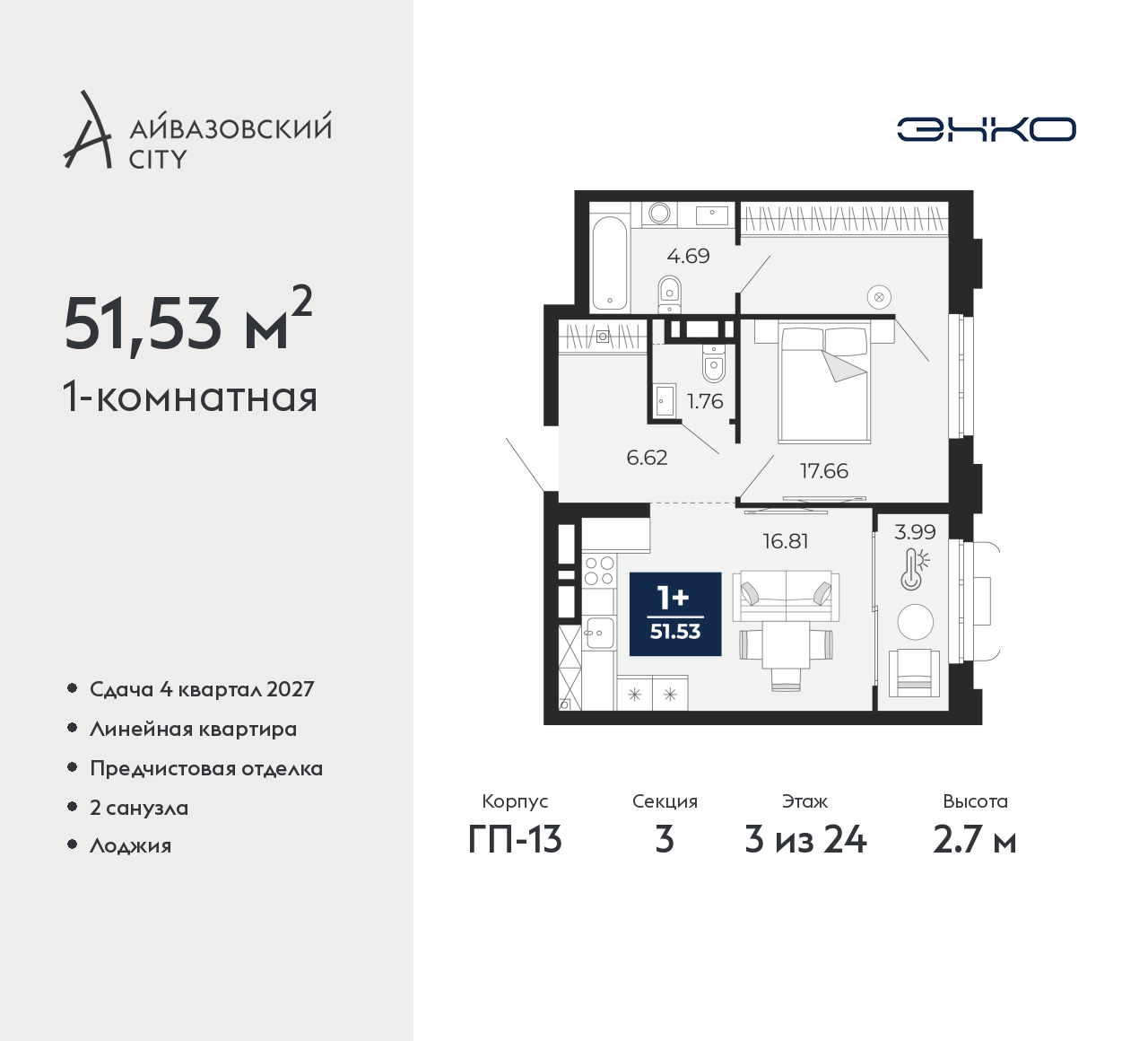 Просторная 1-комн. квартира с предчистовой отделкой в ЖК "Айвазовский City" на 3 этаже. Общая площадь: 51.53 кв.м., жилая: 17.66 кв.м., площадь просторной кухни-столовой: 16.81 кв.м. Все окна выходят на одну сторону. В квартире одна лоджия, один совмещенный и один раздельный санузел. Высота потолков 2.7 м. Дом монолитный, многоподъездный, высотой 24 этажа. Квартира находится в 3-й секции в корпусе ГП-13. На этаже 9 квартир. В подъезде 1 пассажирский и 1 грузовой лифт. Окончание строительства - 4 квартал 2027 года. Оформление сделки по договору долевого участия. Новый жилой район располагается в живописном месте на берегу Туры в центральной части города. Принципиально новое пространство для жизни в центре современного города для тех, чьи мечты сбываются, кто нацелен на постоянный рост, перемены к лучшему для себя и своих близких. Каждая деталь Айвазовский City вдохновляет и заряжает на новые свершения: авторская архитектура, сбалансированная продуманная инфраструктура, дизайнерские дворы со спортивными и детскими площадками, парковые зоны с фонтанами, водный канал, украшающий центральный прогулочный маршрут района и многое другое. В 2019 года проект стал лауреатом престижной премии Urban Awards 2019 в номинации «Лучший строящийся региональный жилой комплекс бизнес-класса». Главная особенность Айвазовский City - соседство разных архитектурных школ в рамках одного дома. Изысканная классика, выразительная эклектика и оригинальный модерн - жить в одном из таких домов настоящий повод для гордости. Айвазовский City это идеальное сочетание комфорта, технологий и развитой инфраструктуры. Вход в подъезд возможен с улицы и со двора. Отправляясь на работу или за покупками, жители могут выйти с внешней стороны дома, а для прогулки с ребенком – со стороны двора. Экологически чистые материалы и энергосберегающие технологии, качественное освещение общественных зон, видеонаблюдение по всей территории жилого района (в том числе в подъездах, лифтах и в подземном паркинге), закрытые дворы с доступом только для жителей Айвазовский City. Часть домов в Айвазовский City будут оснащены подземным паркингом. Востребованный в нашем климатическом поясе формат хранения автомобилей защитит собственность владельца в любое время года. Аккредитация в банках: ОАО «Альфа-Банк», ПАО Банк «ВТБ», «Сбербанк России», ПАО «Газпромбанк», ПАО АКБ «Абсолют Банк» и других. (AQID02520708)