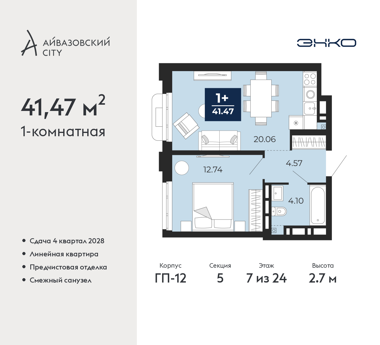 1-комн. квартира от застройщика с предчистовой отделкой в ЖК "Айвазовский City" на 7 этаже. Общая площадь: 41.47 кв.м., жилая: 12.74 кв.м., площадь просторной кухни-столовой: 20.06 кв.м. Все окна выходят на одну сторону. В квартире один совмещенный санузел. Высота потолков 2.7 м. Дом монолитный, многоподъездный, высотой 24 этажа. Квартира находится в 5-й секции в корпусе ГП-12. На этаже 5 квартир. В подъезде 1 пассажирский и 1 грузовой лифт. Окончание строительства - 4 квартал 2028 года. Оформление сделки по договору долевого участия. Новый жилой район располагается в живописном месте на берегу Туры в центральной части города. Принципиально новое пространство для жизни в центре современного города для тех, чьи мечты сбываются, кто нацелен на постоянный рост, перемены к лучшему для себя и своих близких. Каждая деталь Айвазовский City вдохновляет и заряжает на новые свершения: авторская архитектура, сбалансированная продуманная инфраструктура, дизайнерские дворы со спортивными и детскими площадками, парковые зоны с фонтанами, водный канал, украшающий центральный прогулочный маршрут района и многое другое. В 2019 года проект стал лауреатом престижной премии Urban Awards 2019 в номинации «Лучший строящийся региональный жилой комплекс бизнес-класса». Главная особенность Айвазовский City - соседство разных архитектурных школ в рамках одного дома. Изысканная классика, выразительная эклектика и оригинальный модерн - жить в одном из таких домов настоящий повод для гордости. Айвазовский City это идеальное сочетание комфорта, технологий и развитой инфраструктуры. Вход в подъезд возможен с улицы и со двора. Отправляясь на работу или за покупками, жители могут выйти с внешней стороны дома, а для прогулки с ребенком – со стороны двора. Экологически чистые материалы и энергосберегающие технологии, качественное освещение общественных зон, видеонаблюдение по всей территории жилого района (в том числе в подъездах, лифтах и в подземном паркинге), закрытые дворы с доступом только для жителей Айвазовский City. Часть домов в Айвазовский City будут оснащены подземным паркингом. Востребованный в нашем климатическом поясе формат хранения автомобилей защитит собственность владельца в любое время года. Аккредитация в банках: ПАО Банк «ВТБ», ОАО «Альфа-Банк», «Сбербанк России», ПАО «Газпромбанк», ПАО «Промсвязьбанк» и других. (AQID02525636)