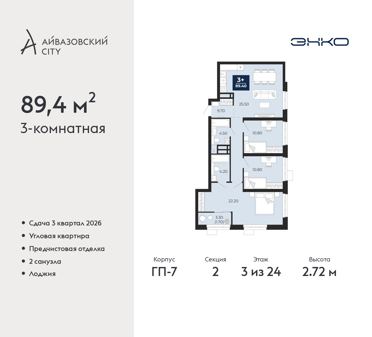3-комн. квартира с предчистовой отделкой в ЖК "Айвазовский City" на 3 этаже. Общая площадь: 89.4 кв.м., жилая: 43.8 кв.м., площадь просторной кухни-столовой: 25.5 кв.м. Угловая квартира, окна oбecпeчивaют paвнoмepнoe ocвeщeниe в тeчeниe дня. В квартире одна лоджия, два совмещенных санузла. Высота потолков 2.72 м. Дом монолитный, многоподъездный, переменной этажности, от 9 до 24 этажей. Квартира находится во 2-й секции высотой 24 этажа в корпусе ГП-7. На этаже 7 квартир. В подъезде 1 пассажирский и 2 грузовых лифта. Окончание строительства - 3 квартал 2026 года. Оформление сделки по договору долевого участия. Новый жилой район располагается в живописном месте на берегу Туры в центральной части города. Принципиально новое пространство для жизни в центре современного города для тех, чьи мечты сбываются, кто нацелен на постоянный рост, перемены к лучшему для себя и своих близких. Каждая деталь Айвазовский City вдохновляет и заряжает на новые свершения: авторская архитектура, сбалансированная продуманная инфраструктура, дизайнерские дворы со спортивными и детскими площадками, парковые зоны с фонтанами, водный канал, украшающий центральный прогулочный маршрут района и многое другое. В 2019 года проект стал лауреатом престижной премии Urban Awards 2019 в номинации «Лучший строящийся региональный жилой комплекс бизнес-класса». Главная особенность Айвазовский City - соседство разных архитектурных школ в рамках одного дома. Изысканная классика, выразительная эклектика и оригинальный модерн - жить в одном из таких домов настоящий повод для гордости. Айвазовский City это идеальное сочетание комфорта, технологий и развитой инфраструктуры. Вход в подъезд возможен с улицы и со двора. Отправляясь на работу или за покупками, жители могут выйти с внешней стороны дома, а для прогулки с ребенком – со стороны двора. Экологически чистые материалы и энергосберегающие технологии, качественное освещение общественных зон, видеонаблюдение по всей территории жилого района (в том числе в подъездах, лифтах и в подземном паркинге), закрытые дворы с доступом только для жителей Айвазовский City. Часть домов в Айвазовский City будут оснащены подземным паркингом. Востребованный в нашем климатическом поясе формат хранения автомобилей защитит собственность владельца в любое время года. Аккредитация в банках: ПАО Банк «ВТБ», ПАО «Газпромбанк», ОАО «Альфа-Банк», «Сбербанк России», ПАО Банк «ФК Открытие» и других. (AQID02487907)