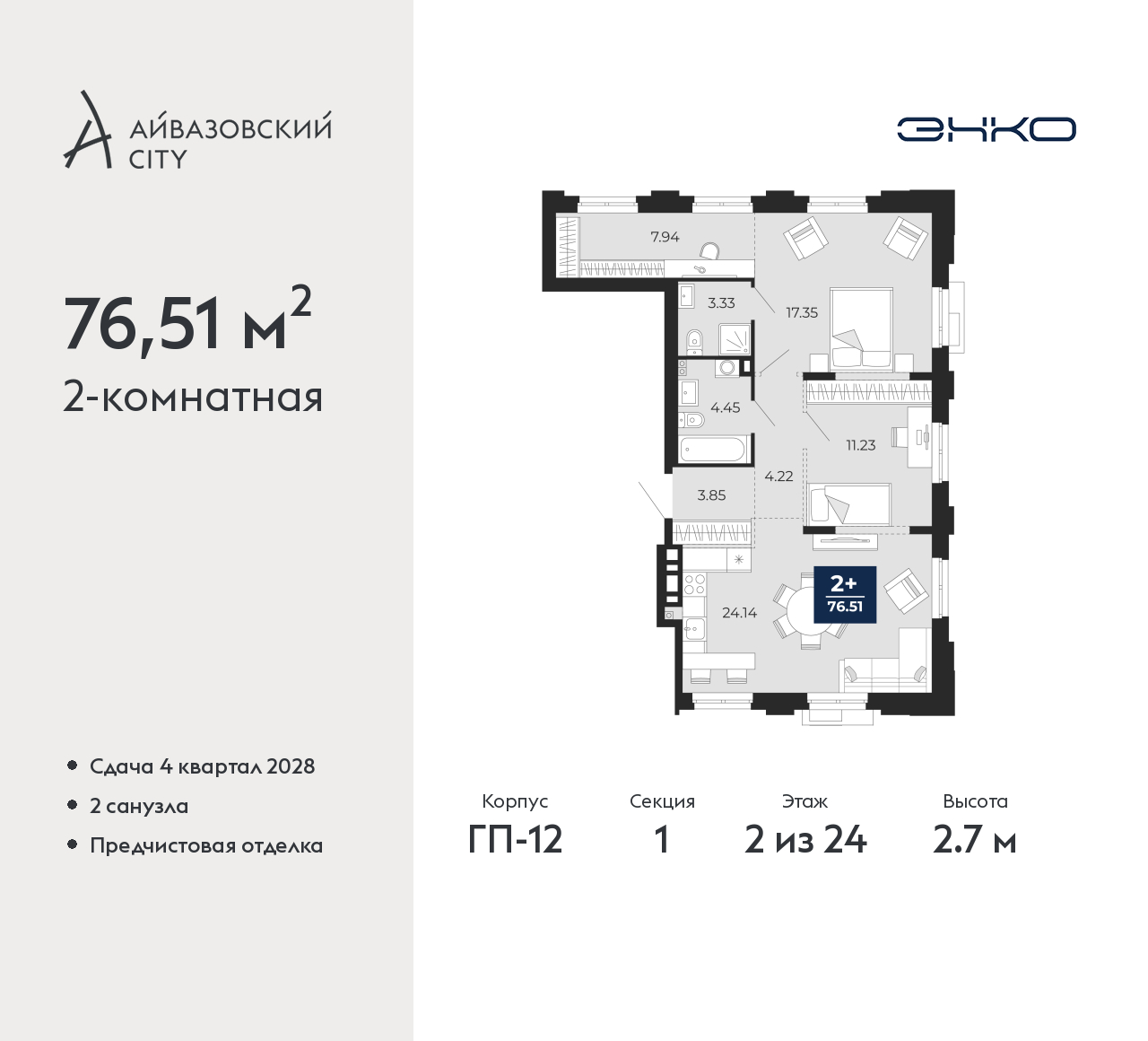 Просторная 2-комн. квартира с предчистовой отделкой в ЖК "Айвазовский City" на 2 этаже. Общая площадь: 76.51 кв.м., жилая: 28.58 кв.м., площадь просторной кухни-столовой: 24.14 кв.м. Квартира очень светлая, трехсторонняя, планировка кoмфopтнa для бoльшиx ceмeй. В квартире два совмещенных санузла. Высота потолков 2.7 м. Дом монолитный, многоподъездный, высотой 24 этажа. Квартира находится в 1-й секции в корпусе ГП-12. На этаже 7 квартир. В подъезде 2 пассажирских и 1 грузовой лифт. Окончание строительства - 4 квартал 2028 года. Оформление сделки по договору долевого участия. Новый жилой район располагается в живописном месте на берегу Туры в центральной части города. Принципиально новое пространство для жизни в центре современного города для тех, чьи мечты сбываются, кто нацелен на постоянный рост, перемены к лучшему для себя и своих близких. Каждая деталь Айвазовский City вдохновляет и заряжает на новые свершения: авторская архитектура, сбалансированная продуманная инфраструктура, дизайнерские дворы со спортивными и детскими площадками, парковые зоны с фонтанами, водный канал, украшающий центральный прогулочный маршрут района и многое другое. В 2019 года проект стал лауреатом престижной премии Urban Awards 2019 в номинации «Лучший строящийся региональный жилой комплекс бизнес-класса». Главная особенность Айвазовский City - соседство разных архитектурных школ в рамках одного дома. Изысканная классика, выразительная эклектика и оригинальный модерн - жить в одном из таких домов настоящий повод для гордости. Айвазовский City это идеальное сочетание комфорта, технологий и развитой инфраструктуры. Вход в подъезд возможен с улицы и со двора. Отправляясь на работу или за покупками, жители могут выйти с внешней стороны дома, а для прогулки с ребенком – со стороны двора. Экологически чистые материалы и энергосберегающие технологии, качественное освещение общественных зон, видеонаблюдение по всей территории жилого района (в том числе в подъездах, лифтах и в подземном паркинге), закрытые дворы с доступом только для жителей Айвазовский City. Часть домов в Айвазовский City будут оснащены подземным паркингом. Востребованный в нашем климатическом поясе формат хранения автомобилей защитит собственность владельца в любое время года. Аккредитация в банках: ПАО «Газпромбанк», ПАО Банк «ВТБ», ОАО «Альфа-Банк», «Сбербанк России», ПАО АКБ «Абсолют Банк» и других. (AQID02521164)
