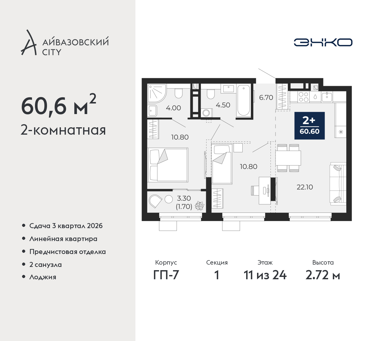 Двухкомнатная квартира от застройщика с предчистовой отделкой в ЖК "Айвазовский City" на 11 этаже. Общая площадь: 60.6 кв.м., жилая: 21.6 кв.м., площадь просторной кухни-столовой: 22.1 кв.м. Комнаты изолированные, все окна выходят на одну сторону. В квартире одна лоджия, два совмещенных санузла. Высота потолков 2.72 м. Дом монолитный, многоподъездный, переменной этажности, от 9 до 24 этажей. Квартира находится в 1-й секции высотой 24 этажа в корпусе ГП-7. На этаже 6 квартир. В подъезде 1 пассажирский и 2 грузовых лифта. Окончание строительства - 3 квартал 2026 года. Оформление сделки по договору долевого участия. Новый жилой район располагается в живописном месте на берегу Туры в центральной части города. Принципиально новое пространство для жизни в центре современного города для тех, чьи мечты сбываются, кто нацелен на постоянный рост, перемены к лучшему для себя и своих близких. Каждая деталь Айвазовский City вдохновляет и заряжает на новые свершения: авторская архитектура, сбалансированная продуманная инфраструктура, дизайнерские дворы со спортивными и детскими площадками, парковые зоны с фонтанами, водный канал, украшающий центральный прогулочный маршрут района и многое другое. В 2019 года проект стал лауреатом престижной премии Urban Awards 2019 в номинации «Лучший строящийся региональный жилой комплекс бизнес-класса». Главная особенность Айвазовский City - соседство разных архитектурных школ в рамках одного дома. Изысканная классика, выразительная эклектика и оригинальный модерн - жить в одном из таких домов настоящий повод для гордости. Айвазовский City это идеальное сочетание комфорта, технологий и развитой инфраструктуры. Вход в подъезд возможен с улицы и со двора. Отправляясь на работу или за покупками, жители могут выйти с внешней стороны дома, а для прогулки с ребенком – со стороны двора. Экологически чистые материалы и энергосберегающие технологии, качественное освещение общественных зон, видеонаблюдение по всей территории жилого района (в том числе в подъездах, лифтах и в подземном паркинге), закрытые дворы с доступом только для жителей Айвазовский City. Часть домов в Айвазовский City будут оснащены подземным паркингом. Востребованный в нашем климатическом поясе формат хранения автомобилей защитит собственность владельца в любое время года. Аккредитация в банках: ПАО «Газпромбанк», «Сбербанк России», ОАО «Альфа-Банк», ПАО Банк «ВТБ», ПАО Банк «ФК Открытие» и других. (AQID02525910)