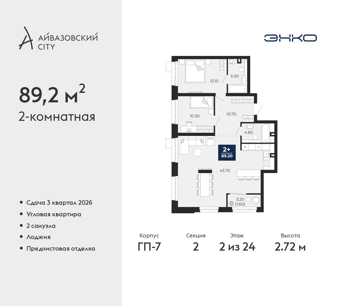 2-комн. квартира с предчистовой отделкой в ЖК "Айвазовский City" на 2 этаже. Общая площадь: 89.2 кв.м., жилая: 23.4 кв.м., площадь просторной кухни-столовой: 43.7 кв.м. Угловая квартира, окна oбecпeчивaют paвнoмepнoe ocвeщeниe в тeчeниe дня. В квартире одна лоджия, два совмещенных санузла. Высота потолков 2.72 м. Дом монолитный, многоподъездный, переменной этажности, от 9 до 24 этажей. Квартира находится во 2-й секции высотой 24 этажа в корпусе ГП-7. На этаже 7 квартир. В подъезде 1 пассажирский и 2 грузовых лифта. Окончание строительства - 3 квартал 2026 года. Оформление сделки по договору долевого участия. Новый жилой район располагается в живописном месте на берегу Туры в центральной части города. Принципиально новое пространство для жизни в центре современного города для тех, чьи мечты сбываются, кто нацелен на постоянный рост, перемены к лучшему для себя и своих близких. Каждая деталь Айвазовский City вдохновляет и заряжает на новые свершения: авторская архитектура, сбалансированная продуманная инфраструктура, дизайнерские дворы со спортивными и детскими площадками, парковые зоны с фонтанами, водный канал, украшающий центральный прогулочный маршрут района и многое другое. В 2019 года проект стал лауреатом престижной премии Urban Awards 2019 в номинации «Лучший строящийся региональный жилой комплекс бизнес-класса». Главная особенность Айвазовский City - соседство разных архитектурных школ в рамках одного дома. Изысканная классика, выразительная эклектика и оригинальный модерн - жить в одном из таких домов настоящий повод для гордости. Айвазовский City это идеальное сочетание комфорта, технологий и развитой инфраструктуры. Вход в подъезд возможен с улицы и со двора. Отправляясь на работу или за покупками, жители могут выйти с внешней стороны дома, а для прогулки с ребенком – со стороны двора. Экологически чистые материалы и энергосберегающие технологии, качественное освещение общественных зон, видеонаблюдение по всей территории жилого района (в том числе в подъездах, лифтах и в подземном паркинге), закрытые дворы с доступом только для жителей Айвазовский City. Часть домов в Айвазовский City будут оснащены подземным паркингом. Востребованный в нашем климатическом поясе формат хранения автомобилей защитит собственность владельца в любое время года. Аккредитация в банках: ОАО «Альфа-Банк», ПАО Банк «ВТБ», ПАО «Газпромбанк», «Сбербанк России», ПАО АКБ «Абсолют Банк» и других. (AQID02483617)