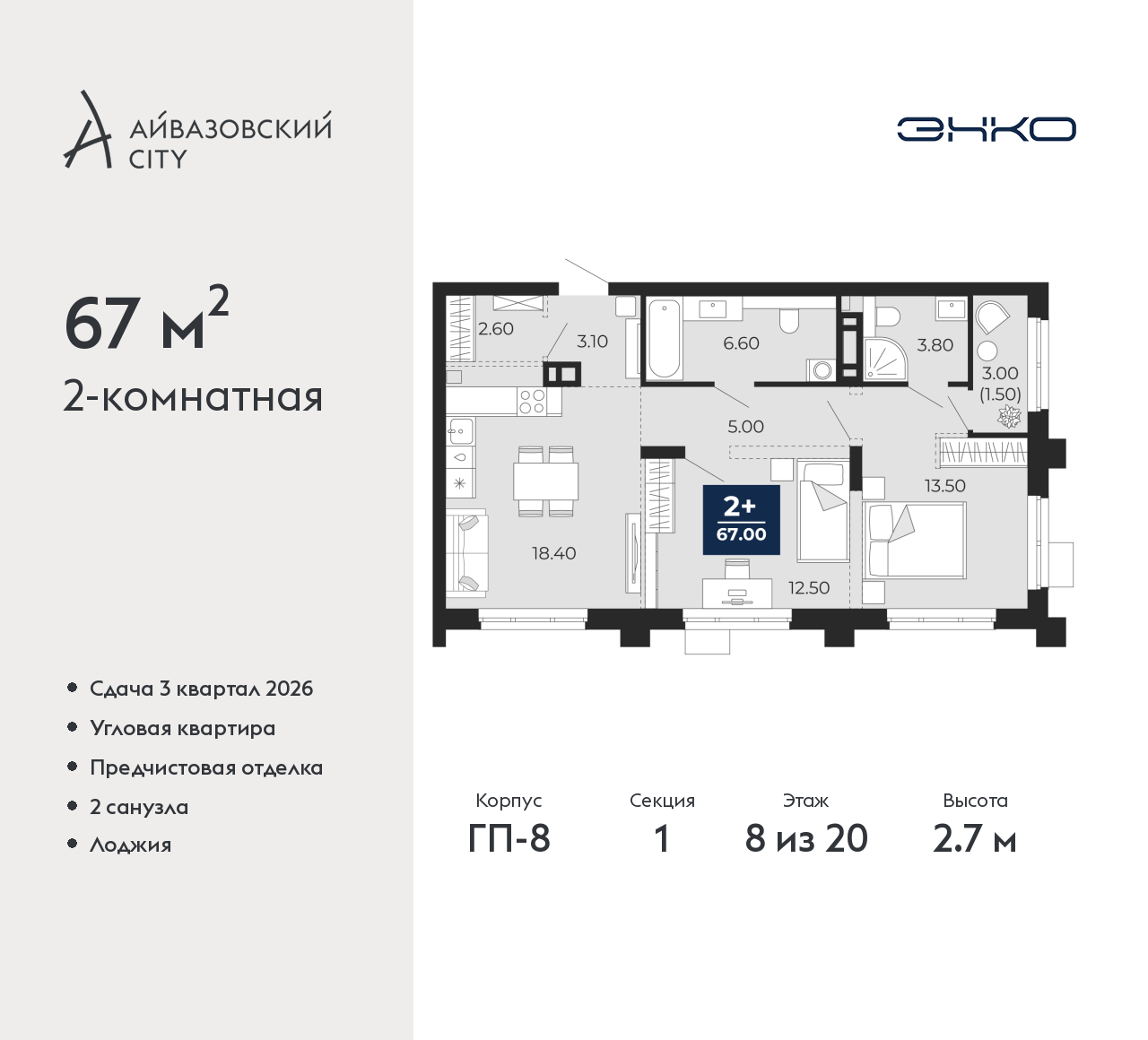 Квартира 2-комн., 67 м2, 8/20 этаж,