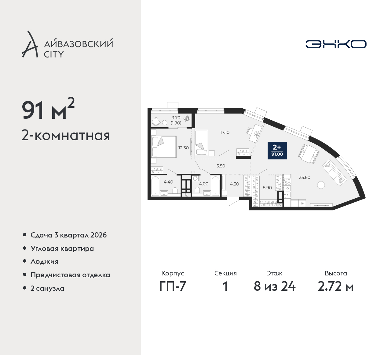 Двухкомнатная квартира с предчистовой отделкой в ЖК "Айвазовский City" на 8 этаже. Общая площадь: 91 кв.м., жилая: 29.4 кв.м., площадь просторной кухни-столовой: 35.6 кв.м. Угловая квартира, очень светлая, естественная вентиляция при открытии окон. В квартире одна лоджия, два совмещенных санузла. Высота потолков 2.72 м. Дом монолитный, многоподъездный, переменной этажности, от 9 до 24 этажей. Квартира находится в 1-й секции высотой 24 этажа в корпусе ГП-7. На этаже 6 квартир. В подъезде 1 пассажирский и 2 грузовых лифта. Окончание строительства - 3 квартал 2026 года. Оформление сделки по договору долевого участия. Новый жилой район располагается в живописном месте на берегу Туры в центральной части города. Принципиально новое пространство для жизни в центре современного города для тех, чьи мечты сбываются, кто нацелен на постоянный рост, перемены к лучшему для себя и своих близких. Каждая деталь Айвазовский City вдохновляет и заряжает на новые свершения: авторская архитектура, сбалансированная продуманная инфраструктура, дизайнерские дворы со спортивными и детскими площадками, парковые зоны с фонтанами, водный канал, украшающий центральный прогулочный маршрут района и многое другое. В 2019 года проект стал лауреатом престижной премии Urban Awards 2019 в номинации «Лучший строящийся региональный жилой комплекс бизнес-класса». Главная особенность Айвазовский City - соседство разных архитектурных школ в рамках одного дома. Изысканная классика, выразительная эклектика и оригинальный модерн - жить в одном из таких домов настоящий повод для гордости. Айвазовский City это идеальное сочетание комфорта, технологий и развитой инфраструктуры. Вход в подъезд возможен с улицы и со двора. Отправляясь на работу или за покупками, жители могут выйти с внешней стороны дома, а для прогулки с ребенком – со стороны двора. Экологически чистые материалы и энергосберегающие технологии, качественное освещение общественных зон, видеонаблюдение по всей территории жилого района (в том числе в подъездах, лифтах и в подземном паркинге), закрытые дворы с доступом только для жителей Айвазовский City. Часть домов в Айвазовский City будут оснащены подземным паркингом. Востребованный в нашем климатическом поясе формат хранения автомобилей защитит собственность владельца в любое время года. Аккредитация в банках: ПАО Банк «ВТБ», «Сбербанк России», ОАО «Альфа-Банк», ПАО «Газпромбанк», ПАО «Промсвязьбанк» и других. (AQID02487895)