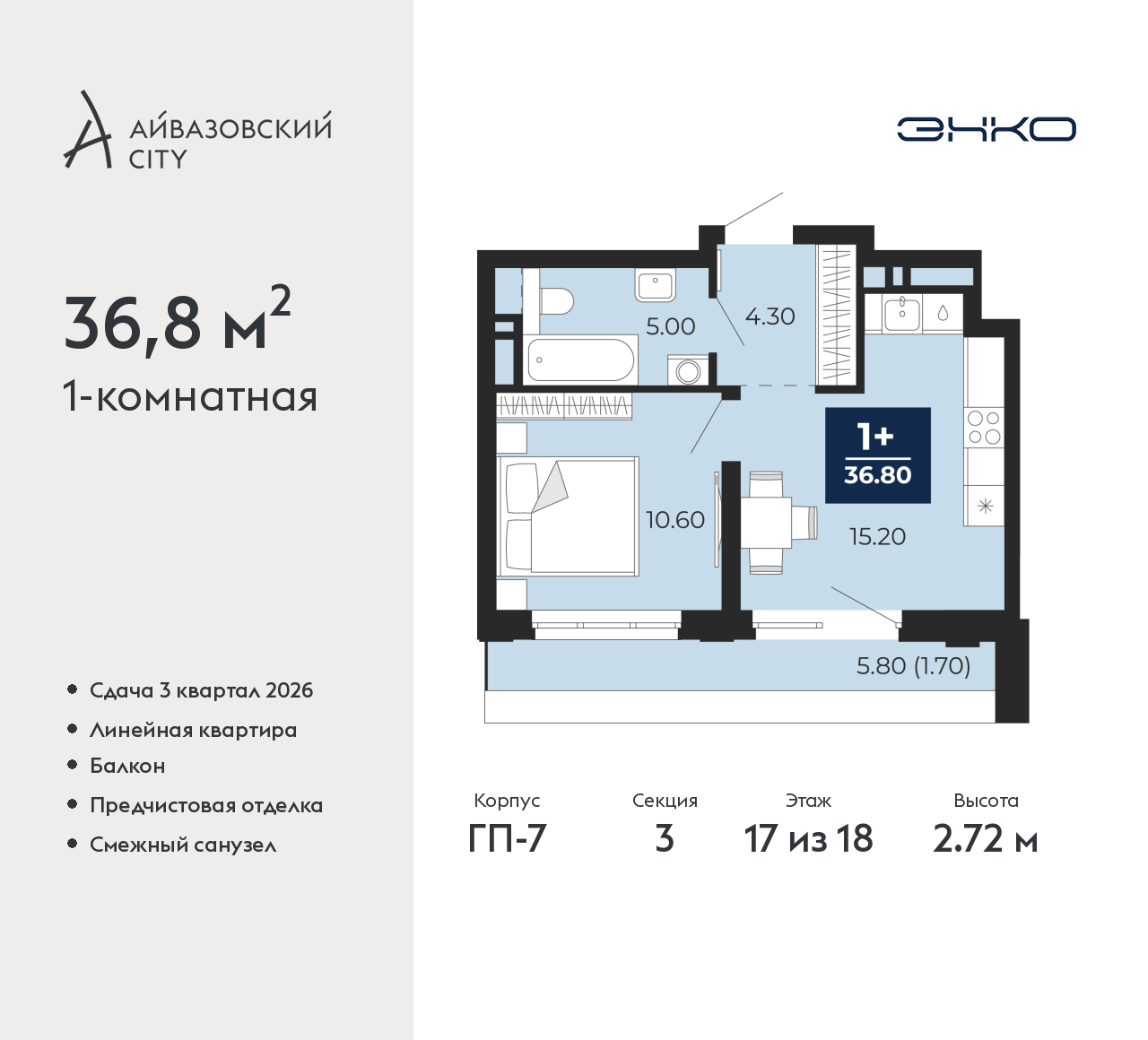1-комн. квартира от застройщика с предчистовой отделкой в ЖК "Айвазовский City" на 17 этаже. Общая площадь: 36.8 кв.м., жилая: 10.6 кв.м., площадь просторной кухни-столовой: 15.2 кв.м. Все окна выходят на одну сторону. В квартире один балкон, один совмещенный санузел. Высота потолков 2.72 м. Дом монолитный, многоподъездный, переменной этажности, от 9 до 24 этажей. Квартира находится в 3-й секции высотой 18 этажей в корпусе ГП-7. На этаже 5 квартир. В подъезде 1 пассажирский и 2 грузовых лифта. Окончание строительства - 3 квартал 2026 года. Оформление сделки по договору долевого участия. Новый жилой район располагается в живописном месте на берегу Туры в центральной части города. Принципиально новое пространство для жизни в центре современного города для тех, чьи мечты сбываются, кто нацелен на постоянный рост, перемены к лучшему для себя и своих близких. Каждая деталь Айвазовский City вдохновляет и заряжает на новые свершения: авторская архитектура, сбалансированная продуманная инфраструктура, дизайнерские дворы со спортивными и детскими площадками, парковые зоны с фонтанами, водный канал, украшающий центральный прогулочный маршрут района и многое другое. В 2019 года проект стал лауреатом престижной премии Urban Awards 2019 в номинации «Лучший строящийся региональный жилой комплекс бизнес-класса». Главная особенность Айвазовский City - соседство разных архитектурных школ в рамках одного дома. Изысканная классика, выразительная эклектика и оригинальный модерн - жить в одном из таких домов настоящий повод для гордости. Айвазовский City это идеальное сочетание комфорта, технологий и развитой инфраструктуры. Вход в подъезд возможен с улицы и со двора. Отправляясь на работу или за покупками, жители могут выйти с внешней стороны дома, а для прогулки с ребенком – со стороны двора. Экологически чистые материалы и энергосберегающие технологии, качественное освещение общественных зон, видеонаблюдение по всей территории жилого района (в том числе в подъездах, лифтах и в подземном паркинге), закрытые дворы с доступом только для жителей Айвазовский City. Часть домов в Айвазовский City будут оснащены подземным паркингом. Востребованный в нашем климатическом поясе формат хранения автомобилей защитит собственность владельца в любое время года. Аккредитация в банках: ПАО «Газпромбанк», «Сбербанк России», ПАО Банк «ВТБ», ОАО «Альфа-Банк», ПАО Банк «ФК Открытие» и других. (AQID02487965)