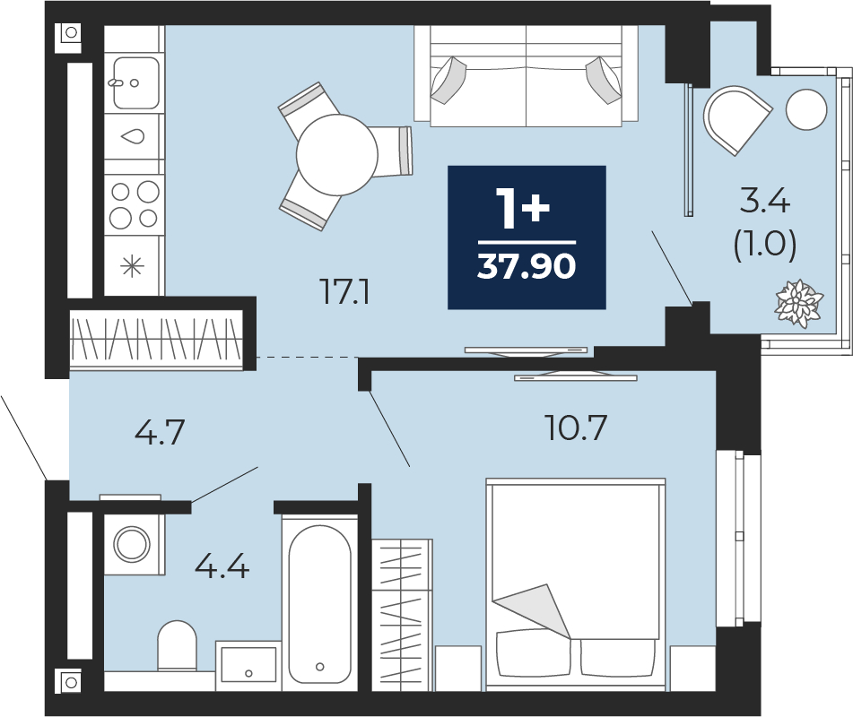 - Общая площадь 37.9 м²