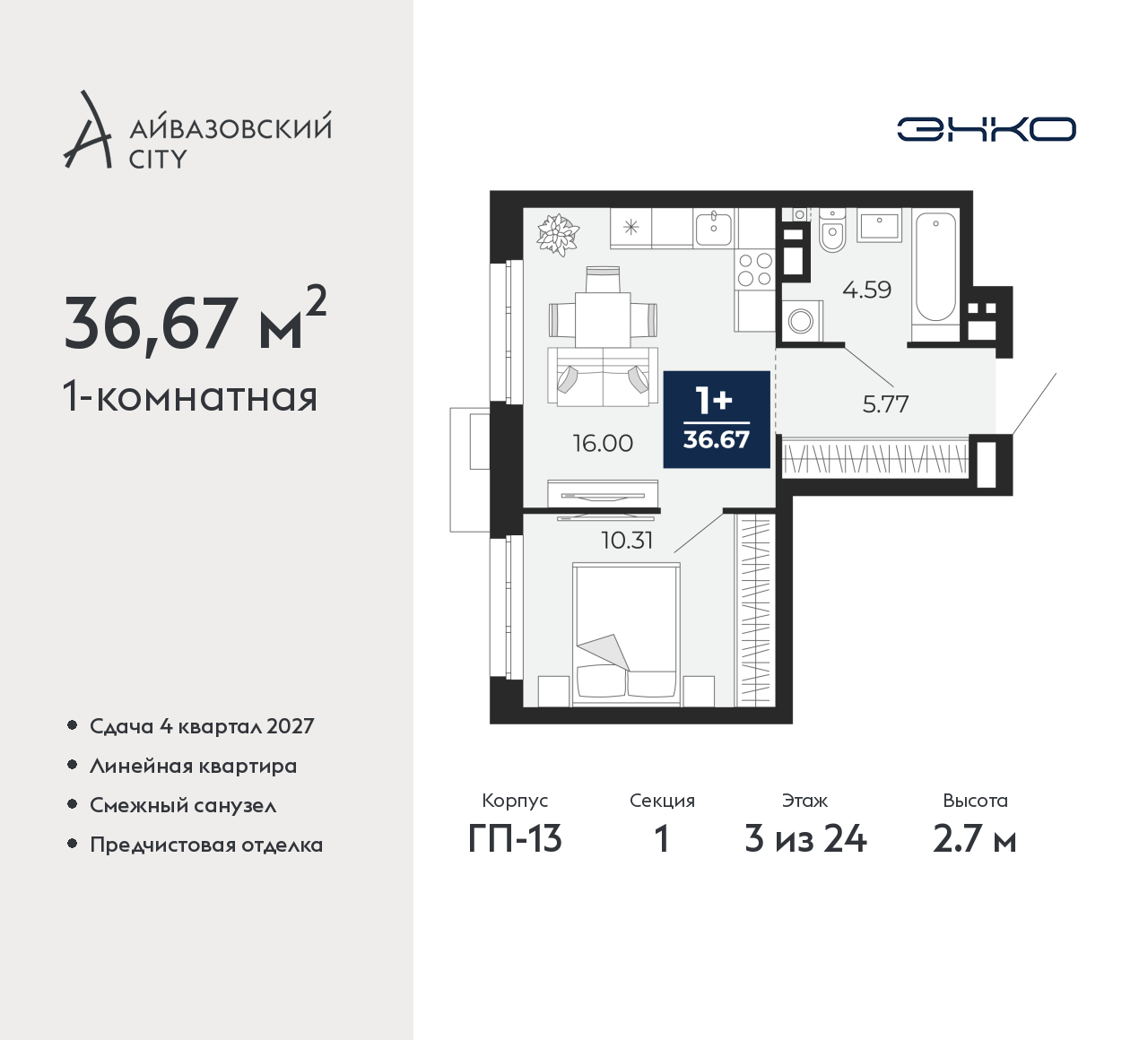 Продается однокомнатная квартира от застройщика с предчистовой отделкой в ЖК "Айвазовский City" на 3 этаже. Общая площадь: 36.67 кв.м., жилая: 10.31 кв.м., площадь просторной кухни-столовой: 16 кв.м. Все окна выходят на одну сторону. В квартире один совмещенный санузел. Высота потолков 2.7 м. Дом монолитный, многоподъездный, высотой 24 этажа. Квартира находится в 1-й секции в корпусе ГП-13. На этаже 2 квартиры. Окончание строительства - 4 квартал 2027 года. Оформление сделки по договору долевого участия. Новый жилой район располагается в живописном месте на берегу Туры в центральной части города. Принципиально новое пространство для жизни в центре современного города для тех, чьи мечты сбываются, кто нацелен на постоянный рост, перемены к лучшему для себя и своих близких. Каждая деталь Айвазовский City вдохновляет и заряжает на новые свершения: авторская архитектура, сбалансированная продуманная инфраструктура, дизайнерские дворы со спортивными и детскими площадками, парковые зоны с фонтанами, водный канал, украшающий центральный прогулочный маршрут района и многое другое. В 2019 года проект стал лауреатом престижной премии Urban Awards 2019 в номинации «Лучший строящийся региональный жилой комплекс бизнес-класса». Главная особенность Айвазовский City - соседство разных архитектурных школ в рамках одного дома. Изысканная классика, выразительная эклектика и оригинальный модерн - жить в одном из таких домов настоящий повод для гордости. Айвазовский City это идеальное сочетание комфорта, технологий и развитой инфраструктуры. Вход в подъезд возможен с улицы и со двора. Отправляясь на работу или за покупками, жители могут выйти с внешней стороны дома, а для прогулки с ребенком – со стороны двора. Экологически чистые материалы и энергосберегающие технологии, качественное освещение общественных зон, видеонаблюдение по всей территории жилого района (в том числе в подъездах, лифтах и в подземном паркинге), закрытые дворы с доступом только для жителей Айвазовский City. Часть домов в Айвазовский City будут оснащены подземным паркингом. Востребованный в нашем климатическом поясе формат хранения автомобилей защитит собственность владельца в любое время года. Аккредитация в банках: «Сбербанк России», ОАО «Альфа-Банк», ПАО Банк «ВТБ», ПАО «Газпромбанк», ПАО «Промсвязьбанк» и других. (AQID02522811)