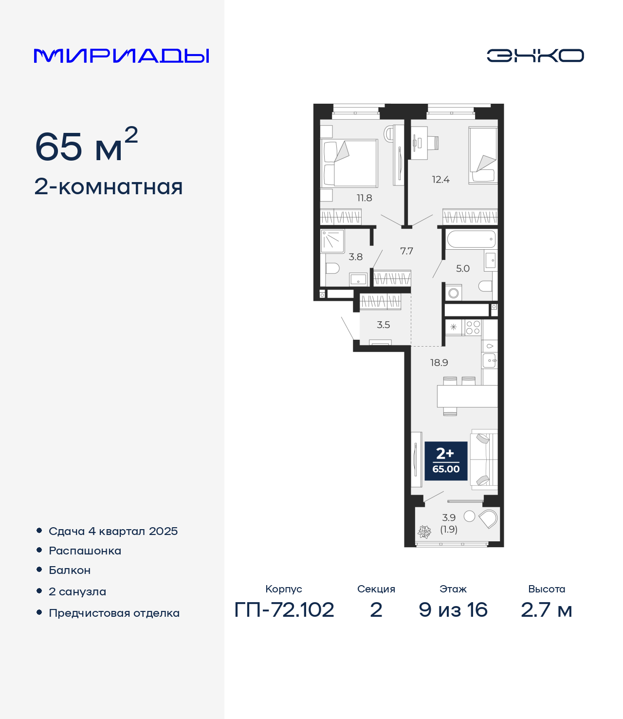 - Высота потолков, м 2.7