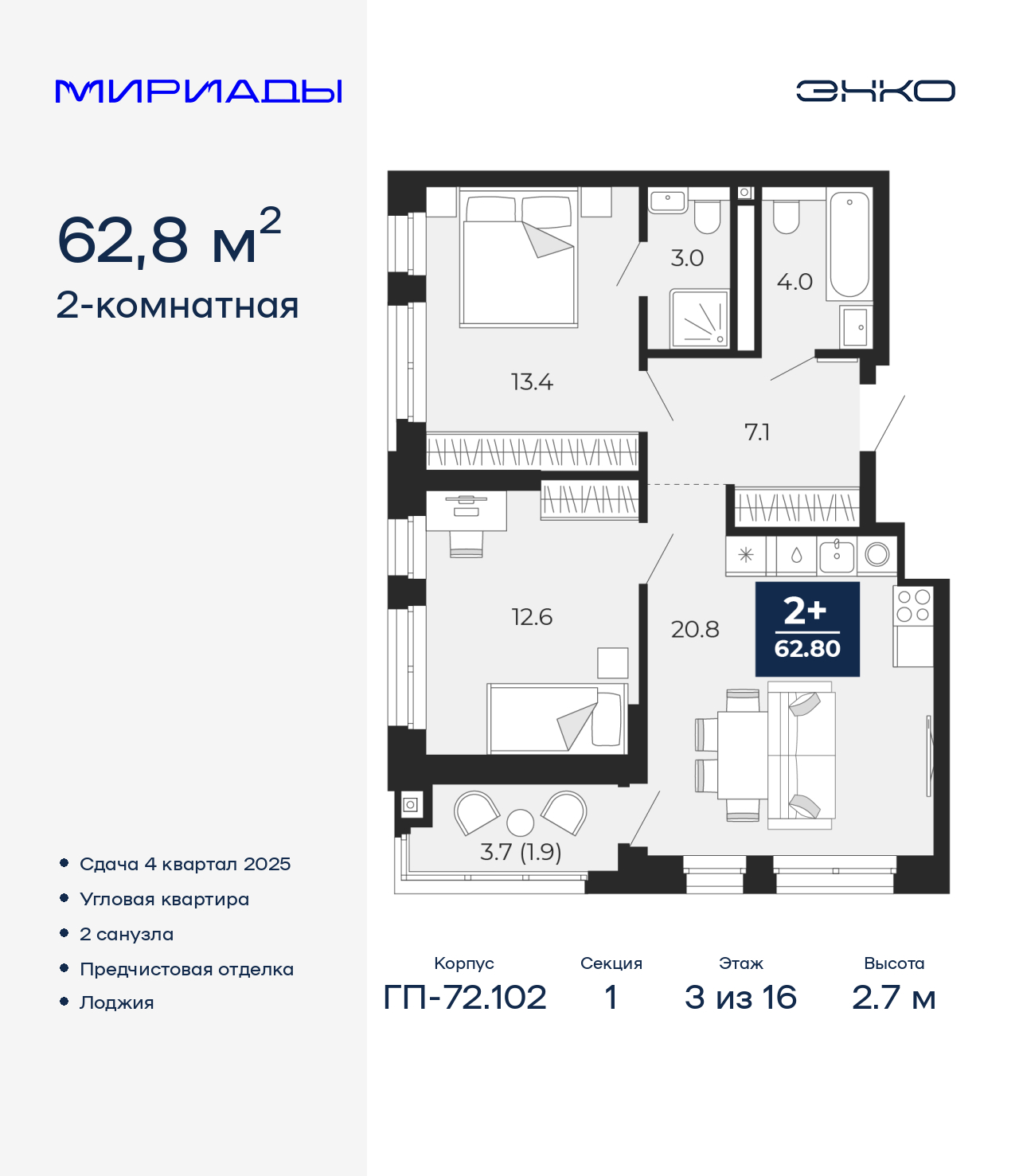Продается 2-комн. квартира с предчистовой отделкой в ЖК "Мириады" на 3 этаже. Общая площадь: 62.8 кв.м., жилая: 26 кв.м., площадь просторной кухни-столовой: 20.8 кв.м. Угловая квартира, окна oбecпeчивaют paвнoмepнoe ocвeщeниe в тeчeниe дня. В квартире одна лоджия, два совмещенных санузла. Высота потолков 2.7 м. Дом монолитный, многоподъездный, переменной этажности, от 14 до 16 этажей. Квартира находится в 1-й секции высотой 16 этажей в корпусе ГП-72.102. На этаже 9 квартир. В подъезде 1 пассажирский и 1 грузовой лифт. Окончание строительства - 4 квартал 2025 года. Оформление сделки по договору долевого участия. Вселенная бесконечных историй. Ранее невиданный Тюмени масштаб: территория 240 гектаров и 1 650 000 м² застройки. Мириады – это город масштабных перемен и больших возможностей. Город зеленых рощ и зеркальных озер. Город для работы, учебы и развлечений. Город для детей и их родителей. Город для всех и каждого. Проект расположен в районе Мыс рядом с ТРЦ «Тюмень Сити Молл» в границах улицы Тимофея Чаркова, Тобольского тракта и объездной дороги. Срок полного освоения территории - до 2034 года. (AQID02522745)